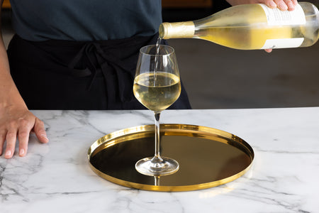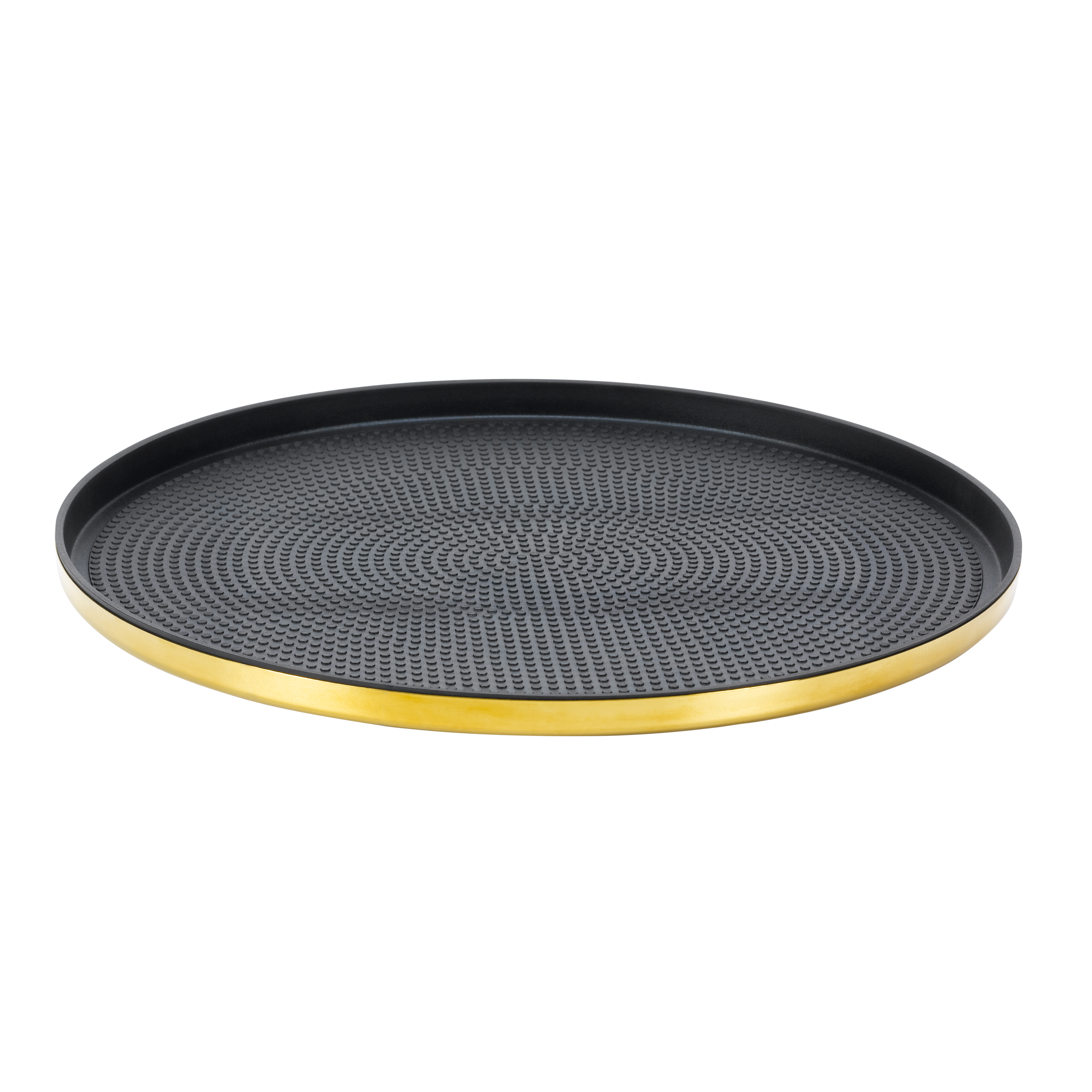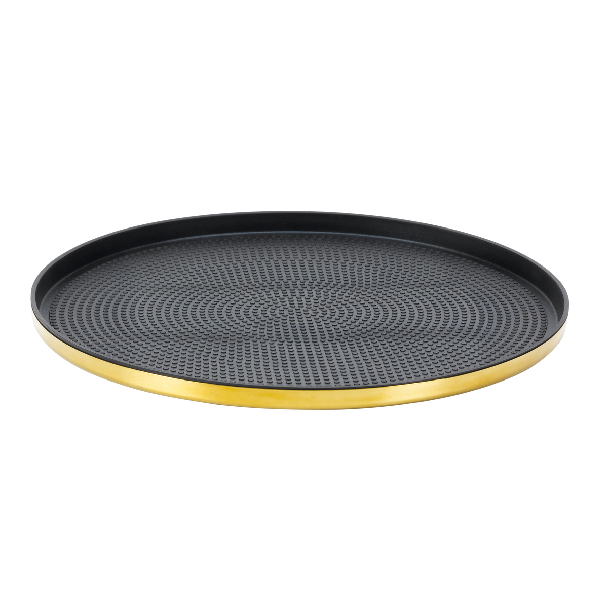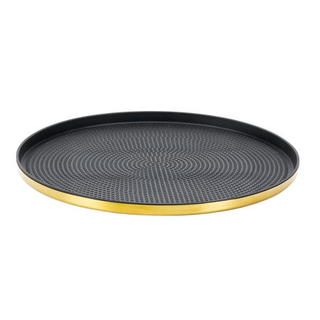 The Modern Edge Round Serving Trays combine sleek design with commercial-grade functionality, offering an elegant solution for food and beverage presentation. Crafted from durable 18/8 stainless steel, these trays feature a high-polished finish in Vintage Gold, Rose Gold, Black Onyx, and Brushed Stainless to complement any upscale dining environment. The Rose Gold, Vintage Gold, and Black Onyx finishes are part of our Metallic Elements Collection, ensuring a striking and sophisticated presentation. Each tray includes a removable textured rubber insert, providing a non-slip surface to keep glasses and dishes securely in place during service. The insert can also be removed for a refined, minimalist look that enhances plated presentations. Available in 9", 12", and 14" sizes, these trays cater to a variety of serving needs, from intimate cocktail settings to large-scale hospitality operations. Their stackable design ensures efficient storage, making them a practical choice for both front-of-house service and back-of-house organization. Designed for convenience, these trays are also dishwasher safe, allowing for effortless cleaning and maintenance. Whether used for serving drinks, appetizers, or plated meals, the Modern Edge Round Serving Trays provide a sophisticated and functional addition to any commercial setting.