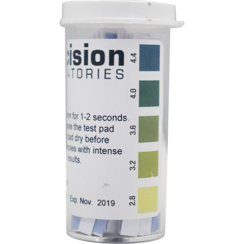 The vial contains 100 strips, and a color reference chart for determining the pH on the outside of the vial.