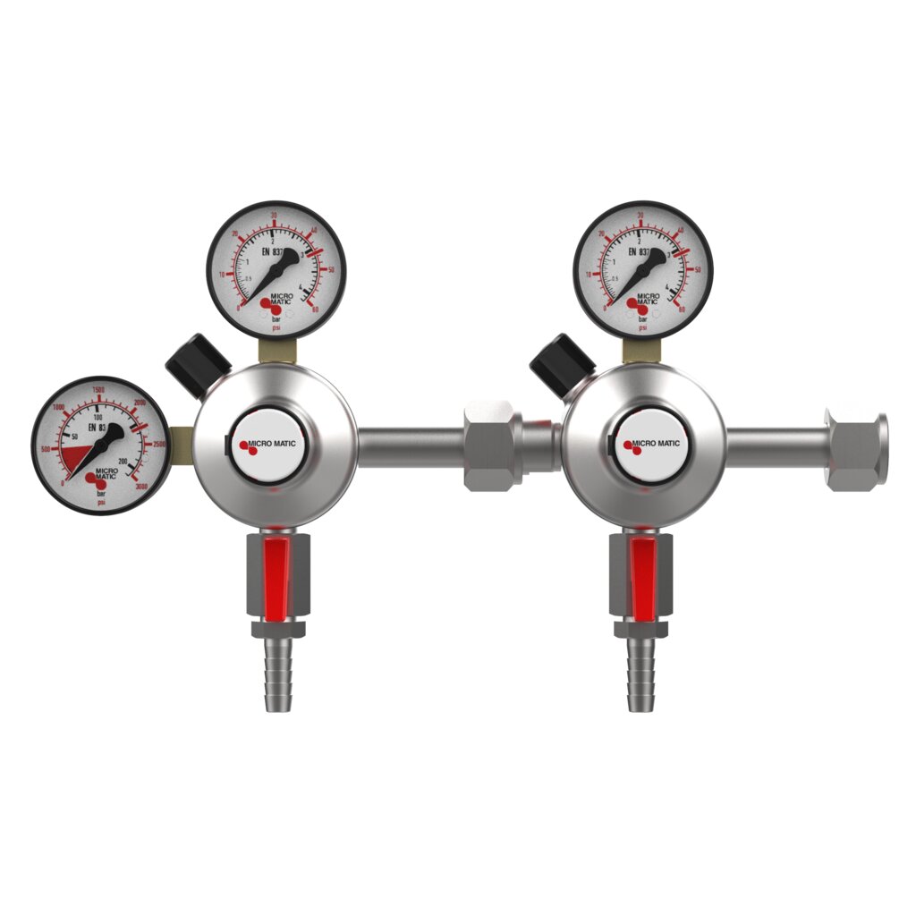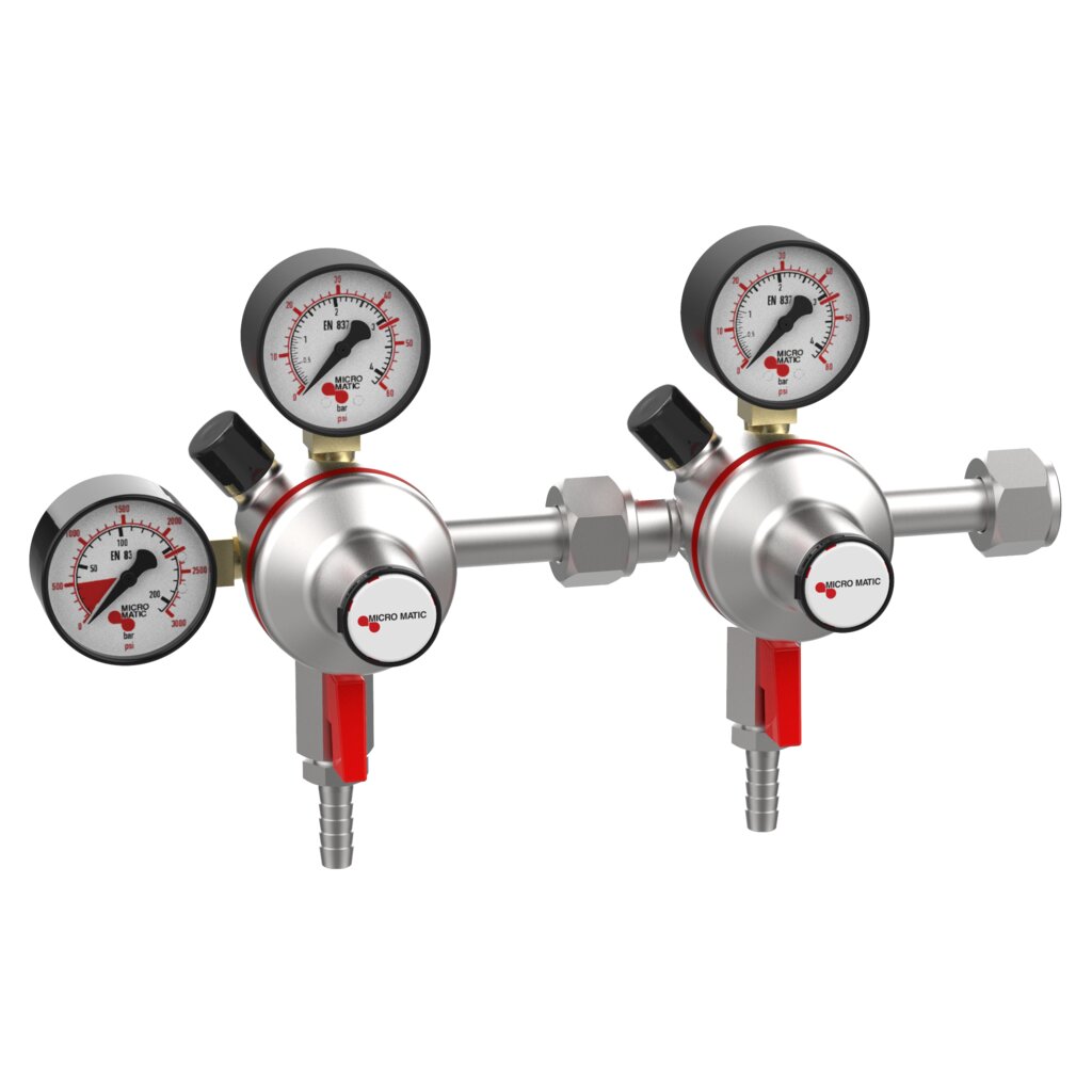 Power up your draft beer system with the Micro Matic Premium Plus CO2 Dual Regulator in a battery (manifold) configuration, designed for primary low-pressure dispensing. Ideal for serving two kegs at separate pressures from a shared CO2 source, this high-performance regulator features two precision 0–60 PSI output gauges and a 3000 PSI tank pressure gauge. Built for durability and accurate flow control, the chrome-plated brass body ensures long-lasting reliability in commercial or home bar environments. Integrated shut-off valves and a safety pressure relief valve provide added protection and easy gas line management. Whether you're running a busy taproom or dual-tap kegerator, this regulator is engineered for efficient, dual-keg performance.