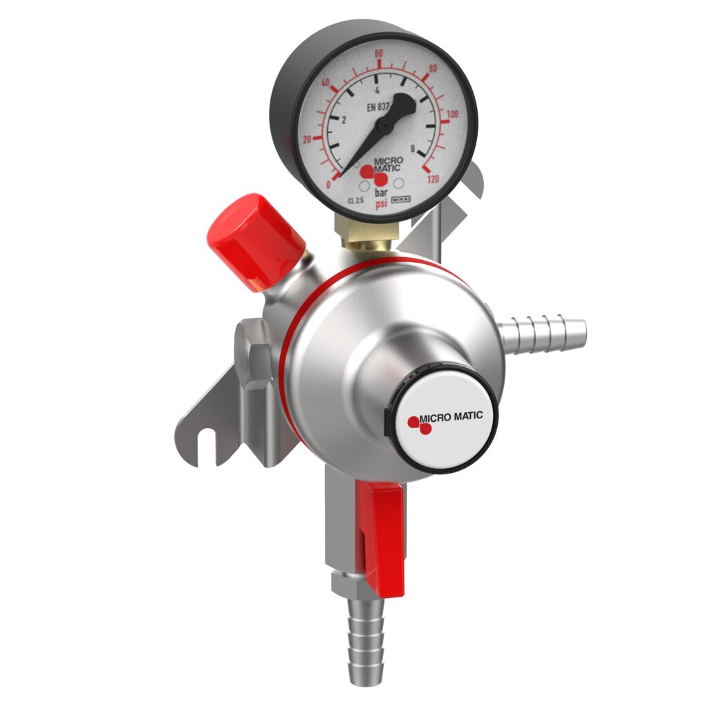 Manage high-pressure draft beverage systems with confidence using the Micro Matic Premium Plus Secondary CO₂ Regulator. Designed for precision pressure control up to 120 PSI, this single-gauge secondary regulator is ideal for carbonated beverages requiring higher serving pressures or for long-draw draft systems. The wall-mount bracket makes installation easy in cooler walls or regulator boards, and the single output gauge allows for consistent monitoring of downstream pressure. Featuring a rugged chrome-plated brass body, integrated shut-off valve, and built-in safety pressure relief valve, this regulator ensures consistent performance, safety, and durability in both commercial and high-output draft environments.