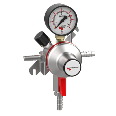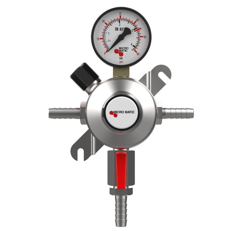 Control downstream gas pressure with pinpoint accuracy using the Micro Matic Premium Plus Secondary CO₂ Regulator. Designed with a single gauge and low-pressure range of 0–60 PSI, this pass-through secondary regulator is ideal for serving a single product at a consistent pressure. Perfect for expanding multi-tap draft systems, the pass-through design allows you to daisy-chain regulators while maintaining precise control for each keg. The chrome-plated brass body provides superior durability, while the integrated shut-off valve and pressure relief valve ensure both performance and safety. Whether you're operating a busy bar or scaling your home setup, this regulator offers clean, reliable gas flow for one keg in a multi-product system.
