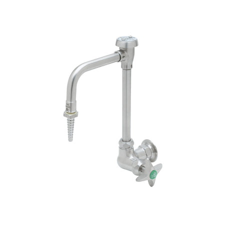 Stainless Steel Lab Single Temperature Wall Mount Faucet, Swivel/Rigid Gooseneck, Vacuum Breaker w/ Serrated Tip, 4-Arm Handle