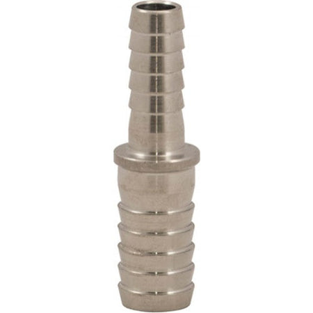 Stainless steel splicer designed for connecting two different sizes of tubing together. The smaller barb will accept 3/16 in or 1/4 in ID tubing (typical to homebrew systems) on one side, and the larger barb will accept 5/15 in or 3/8 in ID tubing common to commercial systems.