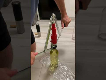 Its unique spring-loaded mechanism securely grips the bottle neck, keeping it steady while the cork is inserted. Simply place a cork in the viewing window and pull down the handles. Cork depth can be customized using the two adjustable nuts on the threaded shaft.