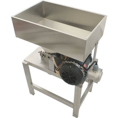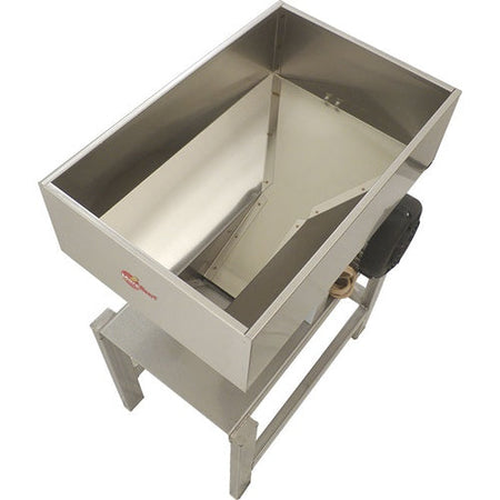 The stainless stand allows for a six gallon reception bucket to be slid under to collect cracked grain. Since grain dust is to be avoided in a brewery we make the bucket-to-stand fit perfectly tight to reduce dust in your brewery. A six gallon bucket will hold 25 pounds of grain, which we have found is a manageable size to lift. For larger batches you can mill into one bucket, turn off the mill, and continue milling into the next bucket.