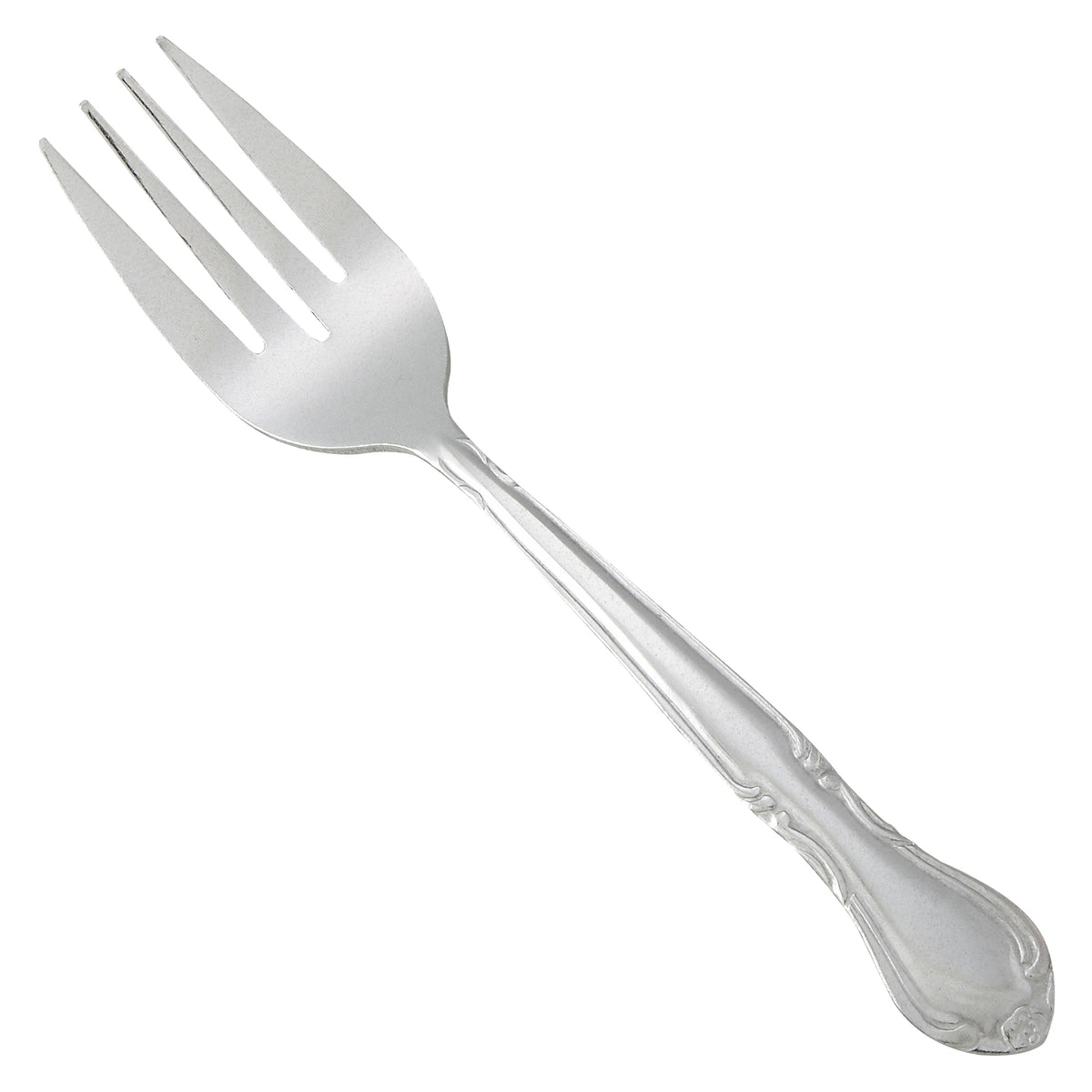 Create an elevated table setting with this commercial-grade 6.75" salad fork, part of the Elegance flatware collection by Winco. This specially designed salad fork features wide tines to provide additional leverage for cutting and spearing large vegetables and leafy greens. The Elegance flatware collection features embossed floral embellishments with a single motif at the handle tip adding a modern touch to traditional flatware patterns. Forged from heavy-duty stainless steel, this heavyweight salad fork is designed to withstand daily use in a commercial foodservice environment making it an ideal choice for hotels, cafes and restaurants.Each piece of the Elegance flatware collection is dishwasher safe for both residential and commercial dishwashers. The elegant mirror finish is designed to last and is resistant to pitting or dulling, even after repeated washes.