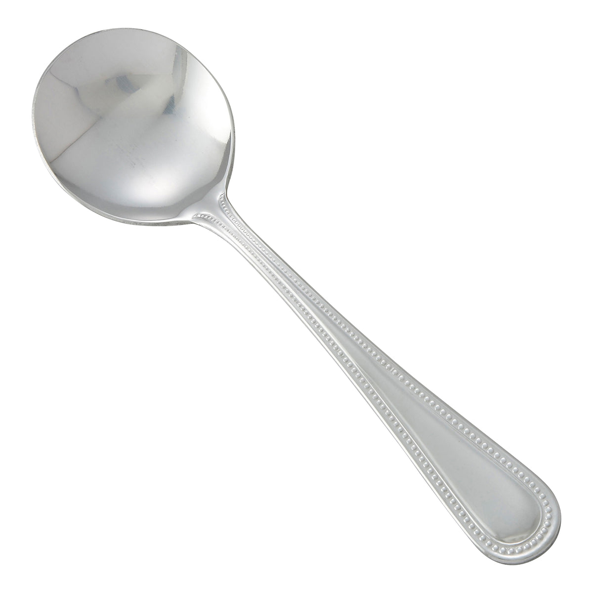 Create an elevated table setting with this commercial-grade 6.75" bouillon spoon, part of the Dots flatware collection by Winco. This bouillon spoon features a shallow bowl designed to contour the interior of a soup bowl making this an ideal spoon for soups, broths and side dishes.The Dots pattern features simple lines and elegant beading details around the handle and neck adding a subtle retro flare to any tabletop. Forged from heavy-duty stainless steel, this heavyweight bouillon spoon is designed to withstand daily use in a commercial foodservice environment making it an ideal choice for hotels, cafes and restaurants.Each piece of the Dots flatware collection is dishwasher safe for both residential and commercial dishwashers. The elegant mirror finish is designed to last and is resistant to pitting or dulling, even after repeated washes.