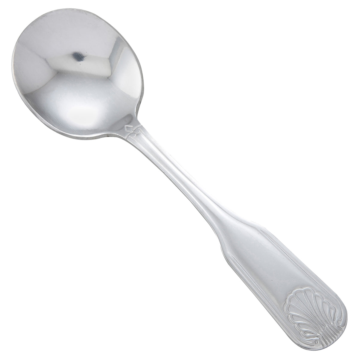 Create an elevated table setting with this commercial-grade 7.5" bouillon spoon, part of the Toulouse flatware collection by Winco. This bouillon spoon features a shallow bowl designed to contour the interior of a soup bowl making this an ideal spoon for soups, broths and side dishes.The Toulouse flatware collection features a fiddle shaped handle with a stylish shell motif that adds a subtle elegance to any table setting. Forged from heavy-duty stainless steel, this heavyweight bouillon spoon is designed to withstand daily use in a commercial foodservice environment making it an ideal choice for hotels, cafes and restaurants.Each piece of the Toulouse flatware collection is dishwasher safe for both residential and commercial dishwashers. The elegant mirror finish is designed to last and is resistant to pitting or dulling, even after repeated washes.