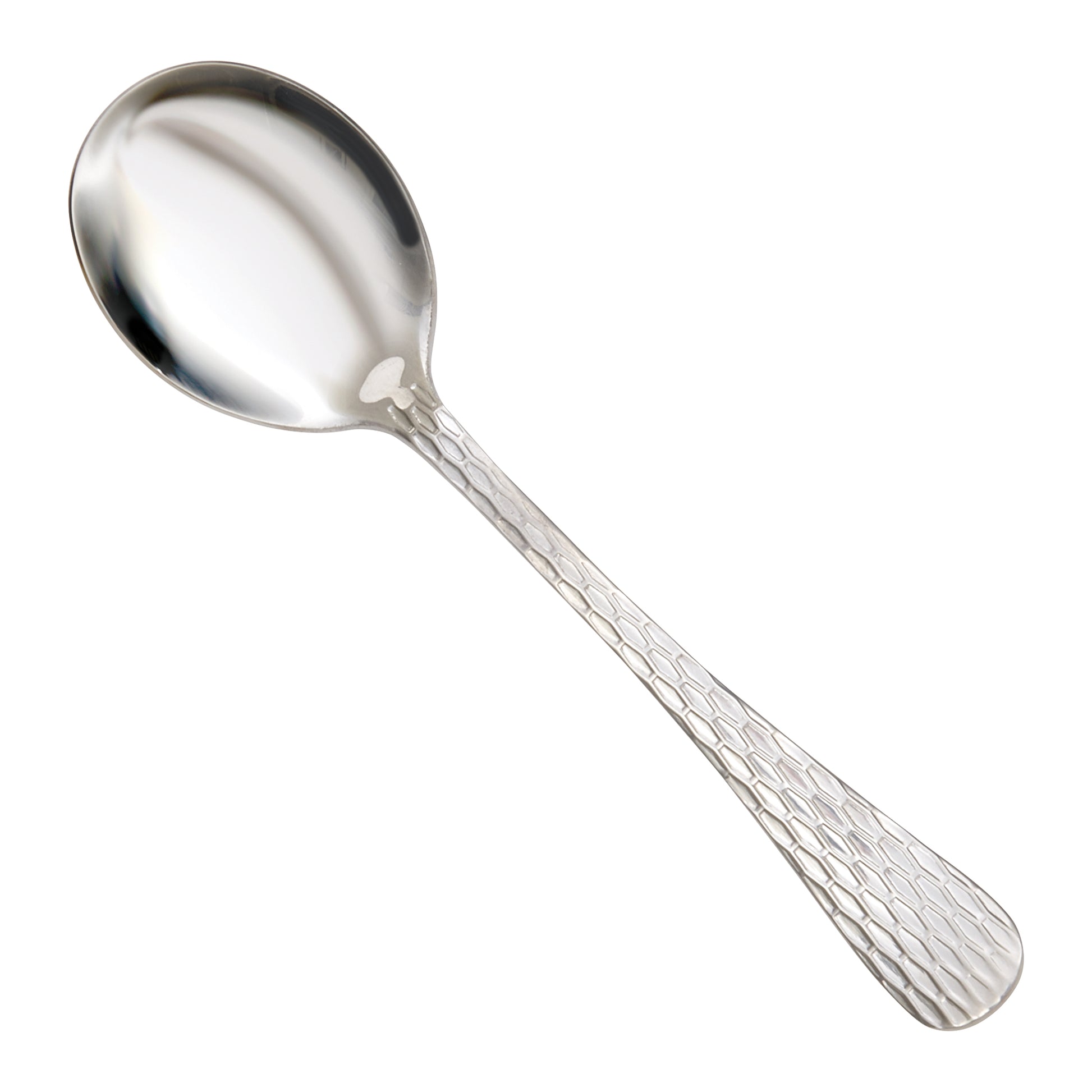 Create an elevated table setting with this commercial-grade 6.25" bouillon spoon, part of the Caspian flatware collection by Winco. This bouillon spoon features a shallow bowl designed to contour the interior of a soup bowl making this an ideal spoon for soups, broths and side dishes. The Caspian pattern invites light to dance across the hammered ripples, a versatile choice for any setting. Forged from stainless steel, this medium weight bouillon spoon is designed to withstand daily use in a commercial foodservice environment making it an ideal choice for hotels, cafes and restaurants. Each piece of the Caspian flatware collection is dishwasher safe for both residential and commercial dishwashers.