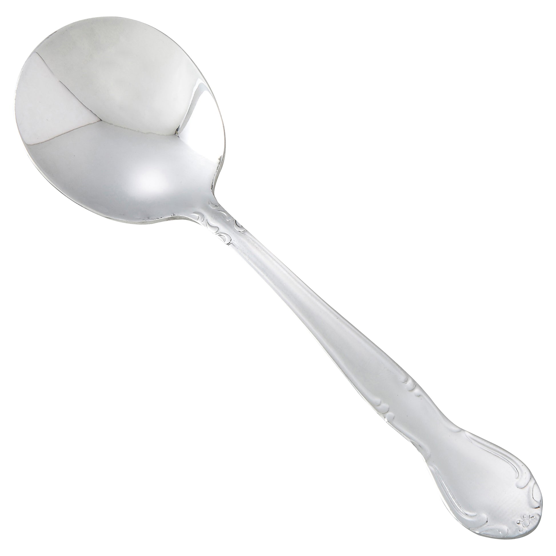 Create an elevated table setting with this commercial-grade 6.75" bouillon spoon, part of the Elegance flatware collection by Winco. This bouillon spoon features a shallow bowl designed to contour the interior of a soup bowl making this an ideal spoon for soups, broths and side dishes.The Elegance flatware collection features embossed floral embellishments with a single motif at the handle tip adding a modern touch to traditional flatware patterns. Forged from heavy-duty stainless steel, this heavyweight bouillon spoon is designed to withstand daily use in a commercial foodservice environment making it an ideal choice for hotels, cafes and restaurants.Each piece of the Elegance flatware collection is dishwasher safe for both residential and commercial dishwashers. The elegant mirror finish is designed to last and is resistant to pitting or dulling, even after repeated washes.
