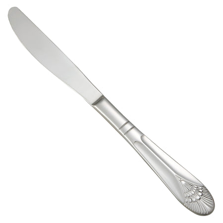 Create an elevated table setting with this commercial-grade 9.75" table knife, part of the Peacock flatware collection by Winco. This versatile table knife is ideal for main courses or as a general purpose knife for main courses, salads and desserts.The Peacock flatware collection features a flared handle and sculpted detailing on the handle that blends seamlessly into any elaborate place setting. Forged from heavy-duty stainless steel, this heavyweight table knife is designed to withstand daily use in a commercial foodservice environment making it an ideal choice for hotels, cafes and restaurants.Each piece of the Peacock flatware collection is dishwasher safe for both residential and commercial dishwashers. The elegant mirror finish is designed to last and is resistant to pitting or dulling, even after repeated washes.