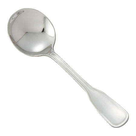 Create an elevated table setting with this commercial-grade 6.5" bouillon spoon, part of the Oxford flatware collection by Winco. This bouillon spoon features a shallow bowl designed to contour the interior of a soup bowl making this an ideal spoon for soups, broths and side dishes.The Oxford flatware collection features a fiddle-shaped handle with subtle grooves that lend a touch of old-fashioned elegance to any setting. Forged from heavy-duty stainless steel, this heavyweight bouillon spoon is designed to withstand daily use in a commercial foodservice environment making it an ideal choice for hotels, cafes and restaurants.Each piece of the Oxford flatware collection is dishwasher safe for both residential and commercial dishwashers. The elegant mirror finish is designed to last and is resistant to pitting or dulling, even after repeated washes.