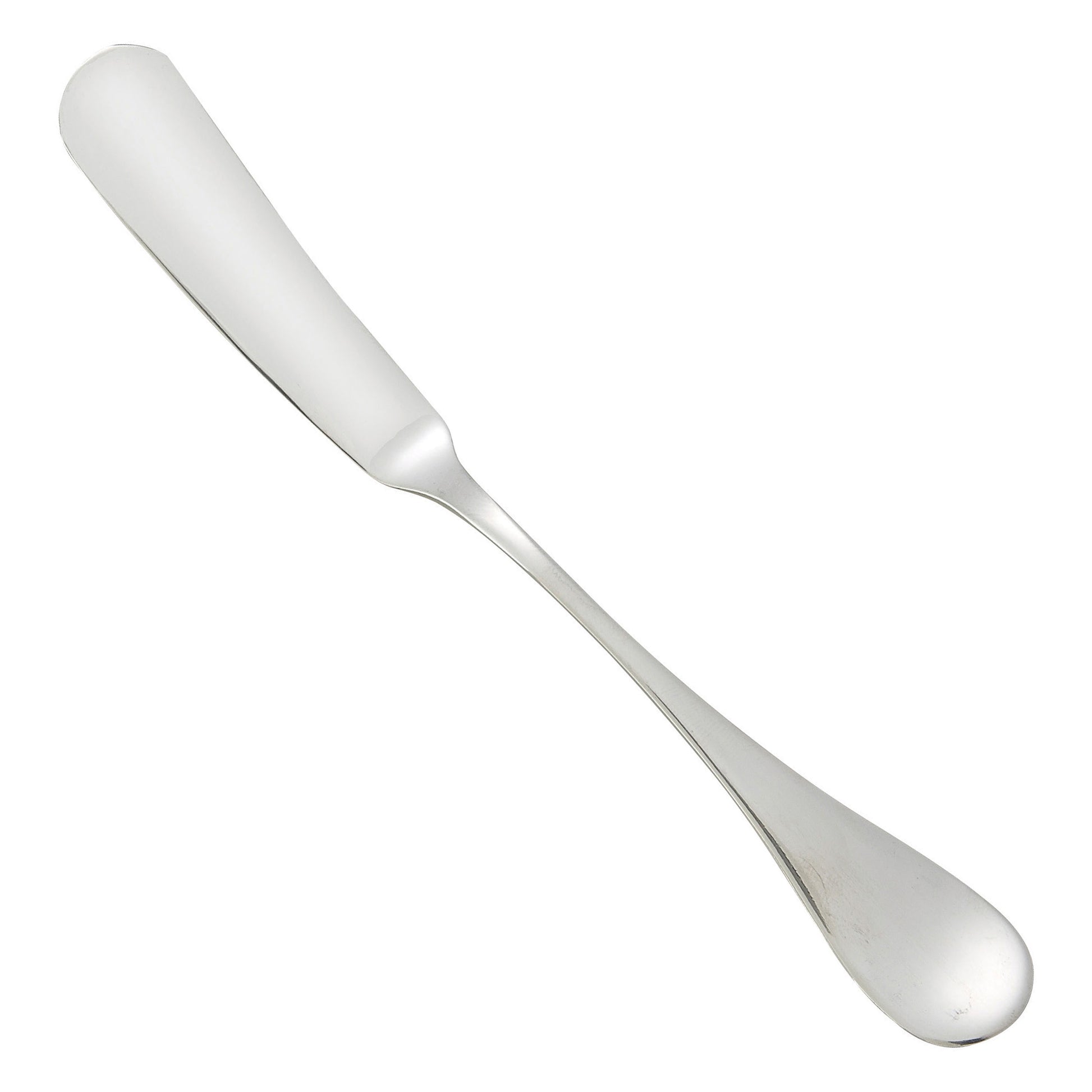 Create an elevated table setting with this commercial-grade 6.75" butter spreading knife, part of the Venice flatware collection by Winco. This butter knife features a dull edge and round point specially designed to spread butter without tearing the bread. Inspired by the water of the floating city, the Venice flatware collection features a smooth surface and rounded end that brings an understanded elegance to any contemporary setting. Forged from heavy-duty stainless steel, this heavyweight butter spreading knife is designed to withstand daily use in a commercial foodservice environment making it an ideal choice for hotels, cafes and restaurants. Each piece of the Venice flatware collection is dishwasher safe for both residential and commercial dishwashers. The elegant mirror finish is designed to last and is resistant to pitting or dulling, even after repeated washes.