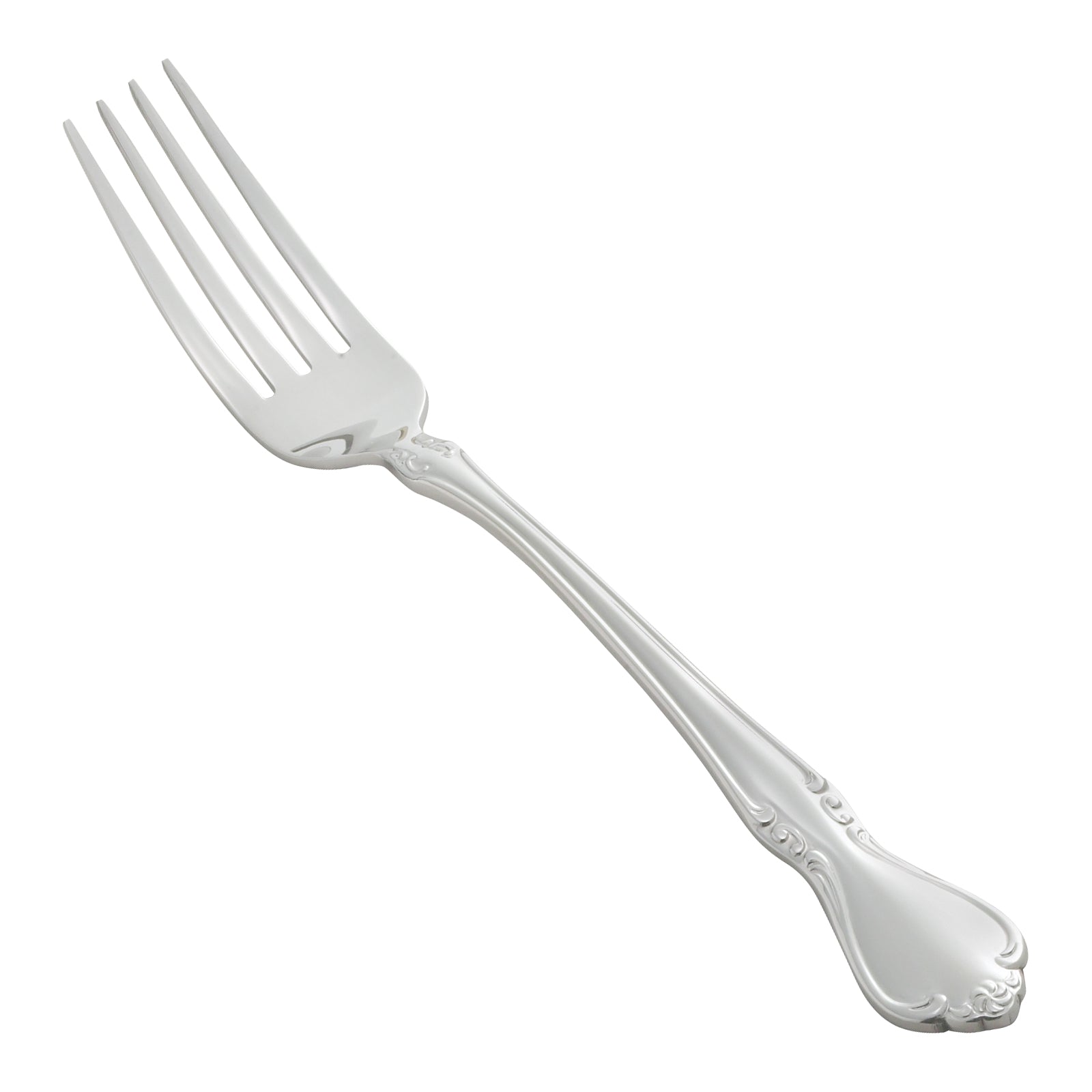 Create an elevated table setting with this commercial-grade 8" table fork, part of the Chantelle flatware collection by Winco. This versatile table fork is ideal for serving entrees or can be used as a general purpose fork for salads and desserts.Inspired by the Regency era, the Chantelle flatware collection by Winco features delicate flourished lines adding a traditional touch to any table. Forged from extra heavy-duty 18/8 stainless steel, this heavyweight table fork features a mirrored finish and is designed to withstand daily use in a commercial foodservice environment making it an ideal choice for hotels, cafes and restaurants.Each piece of the Chantelle flatware collection is dishwasher safe for both residential and commercial dishwashers. The elegant mirror finish is designed to last and is resistant to pitting or dulling, even after repeated washes.