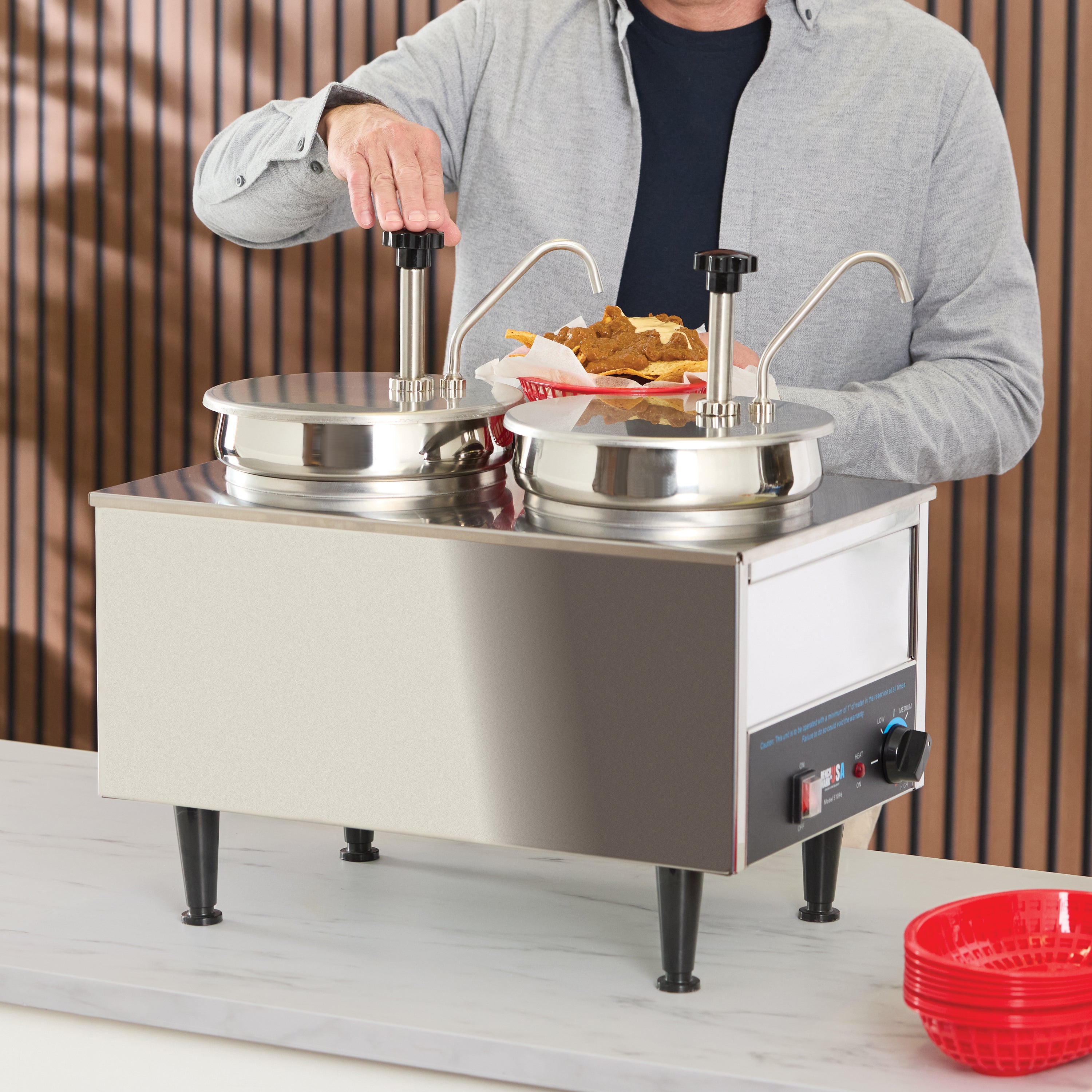 This dual-well warmer includes adaptor plate and accessories. The adjustable thermostat allows for virtually any type of cooking or holding condition.