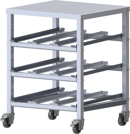 • 3-tier sturdy aluminum construction • Holds up to (36) #10 or (45) #5 cans • Heavy gauge aluminum worktop • 3" swivel casters for mobility, 2 with brake • Fully assembled dimensions: 26-3/4L x 25-1/2D x 33-1/2H • Angled shelves with lifted front edges prevent cans from rolling out; loads from front or rear • NSF listed