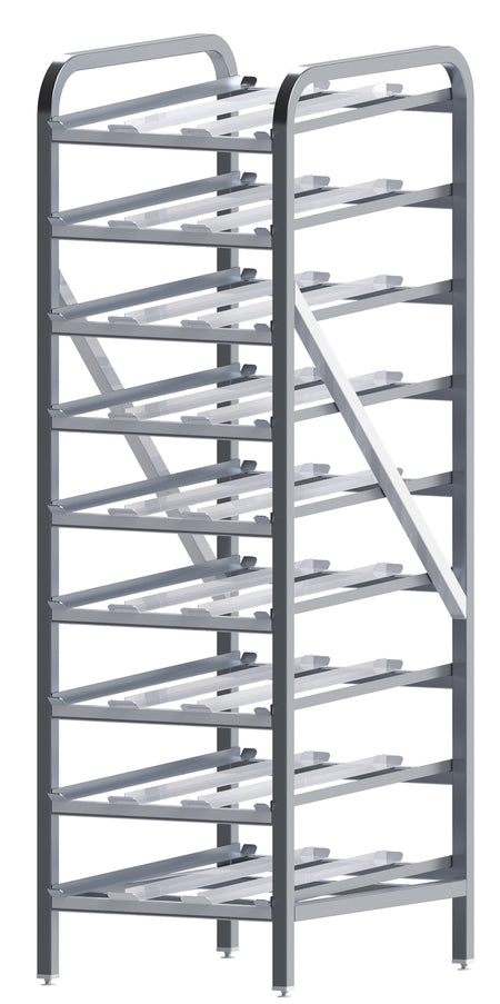 • 9-tier rack • Designed to hold up to (162) #10 or (216) #5 cans • First-in, First-out design for proper stock rotation to maintain quality and freshness • Loads from either front or rear • Angled shelves feature lifted front edges to prevent cans from rolling out • Heavy-duty aluminum construction with reinforced frame and base, ensuring stability • Stainless steel levelers • 7 spacing between each tier • Ships knocked down, assembly required • Fully Assembled Dimensions: • Length: 26.375 • Depth: 34.75 • Height: 82.125