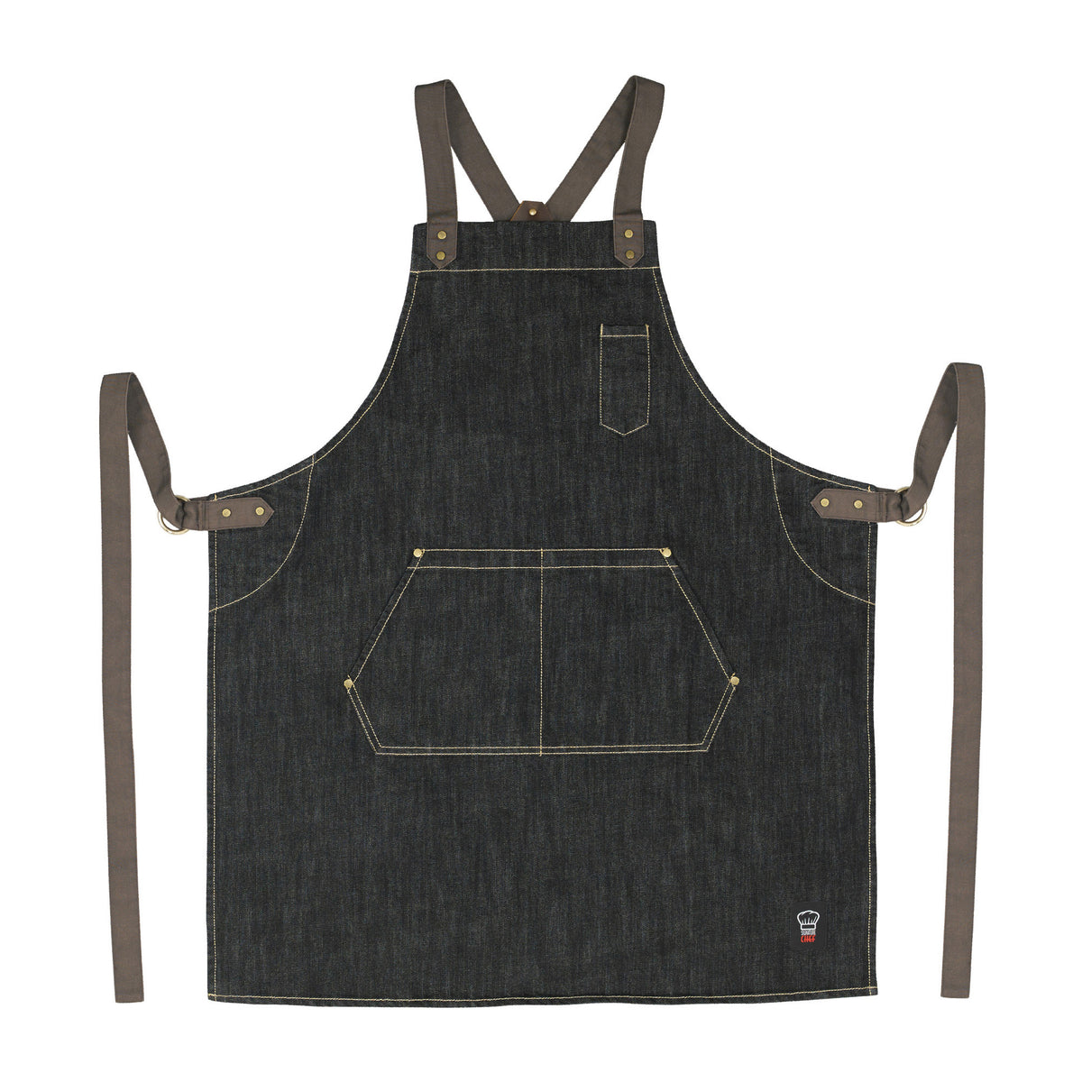 The durable cross-back denim bib apron is a stylish choice for front of house. The dark wash masks spills and stains while keeping up appearances.