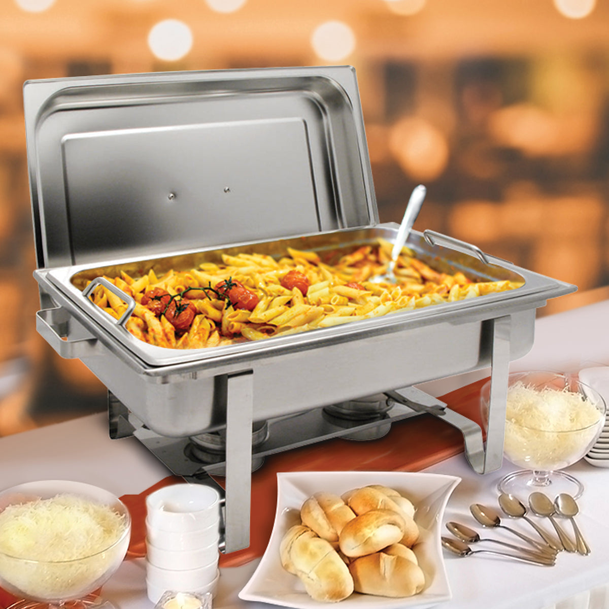 • Includes (1) chafer with stand and lid, (1) full-size food pan with handles, (1) water pan and (2) fuel holders