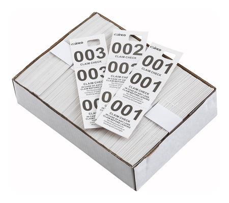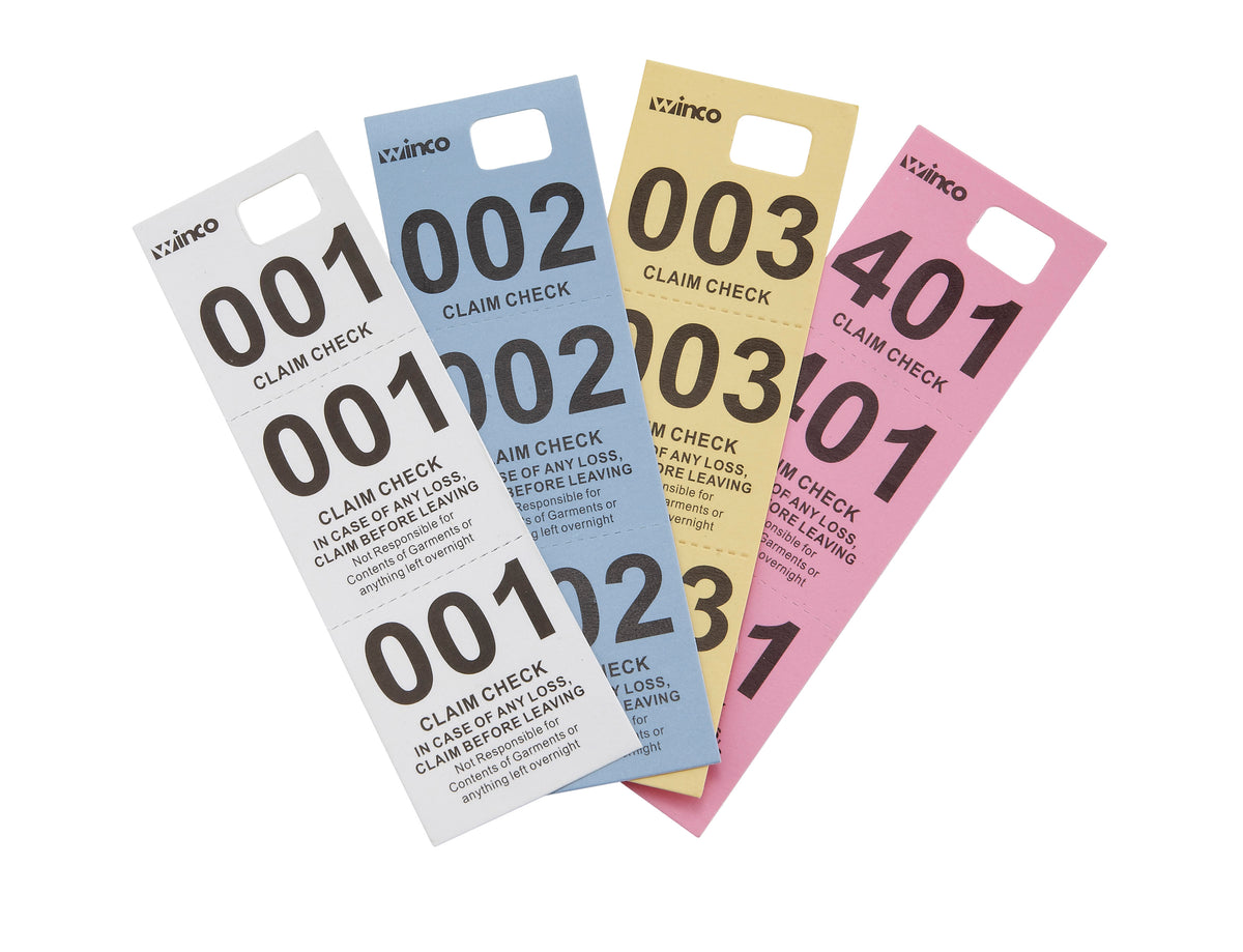 • The Winco CCK-5WT coat check tickets feature 3 identical parts ideal for checking coats and luggage in hotels, restaurants and convention centers. The perforated design ensures quick, clean separation without tearing. The large numbers and bright colors help speed up identification ideal for busy establishments. 500 pieces / box.