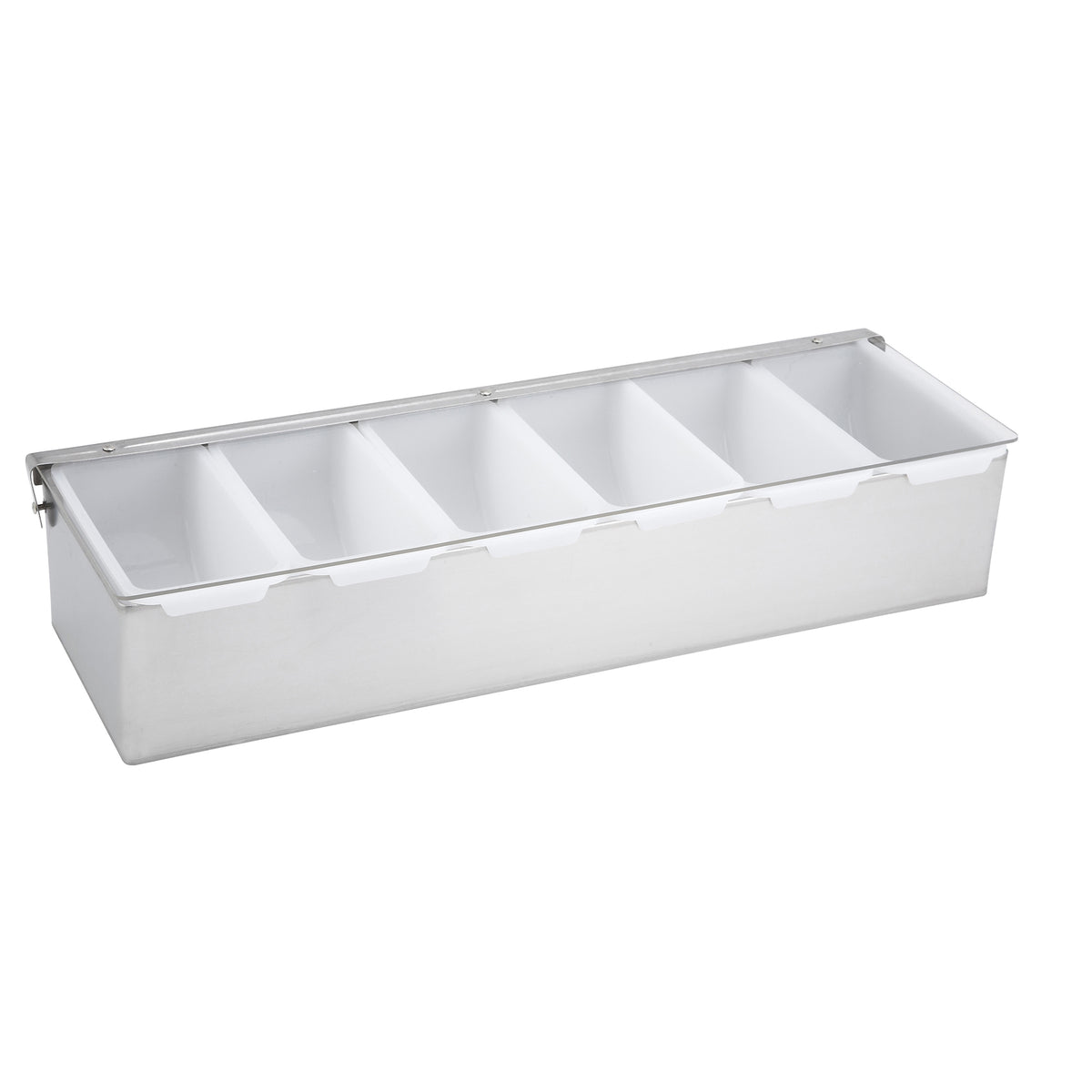 • Attractive satin-finish stainless steel shell with open bottom - can place over ice to chill • Clear-view plastic hinged cover keeps contents free of debris • 6 white plastic removable inserts with curved bottom for easy cleaning