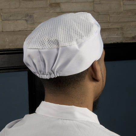 • Pillbox Style – Timeless chef hat design that coordinates with any chef coat and pants for an upscale appearance • Ventilation Panel – Mesh top panel provides maximum airflow • Elastic Band – Hat securely stays in place with a comfortable elastic band • Breathable – Lightweight poly-cotton blend ensures breathability in hot kitchens • Machine Washable