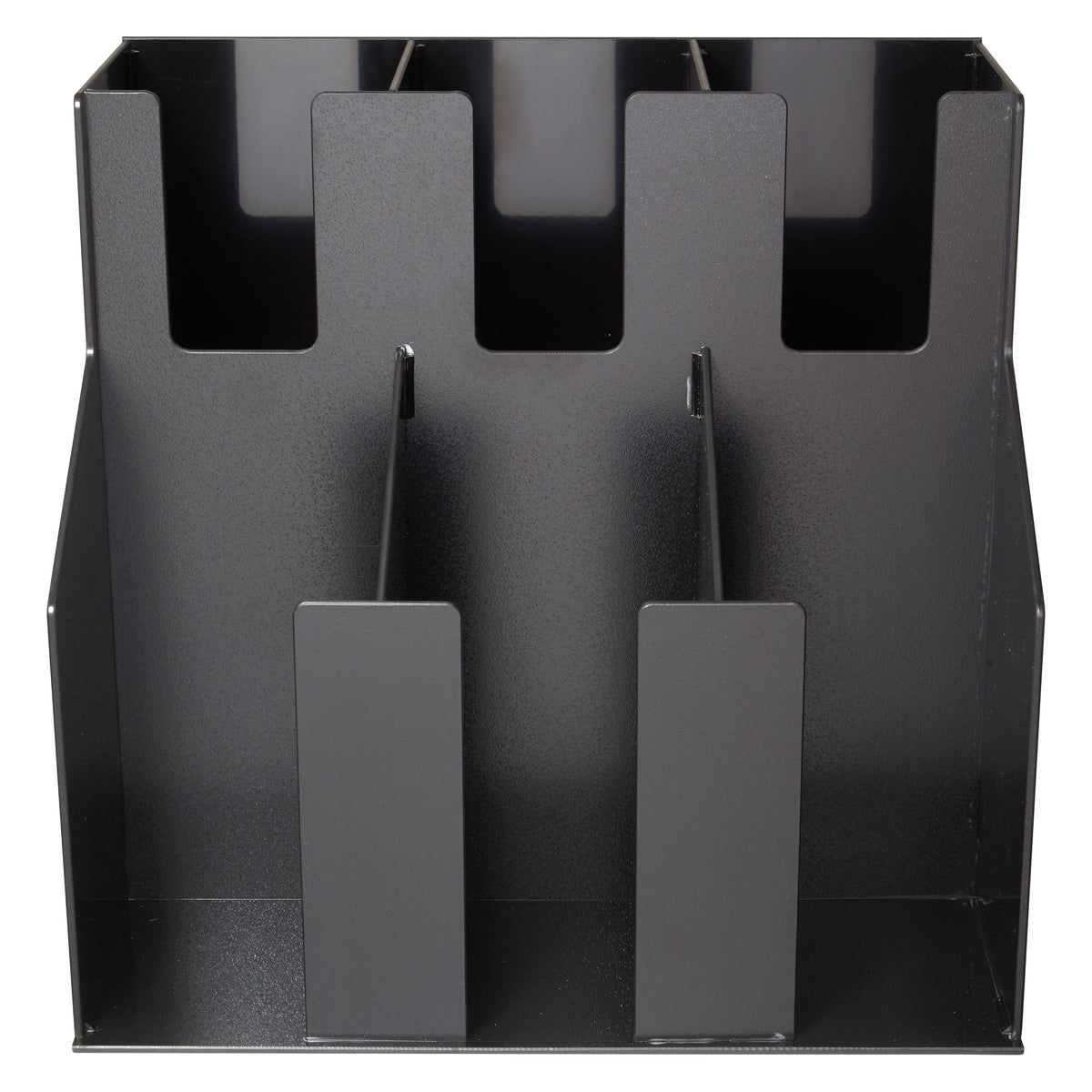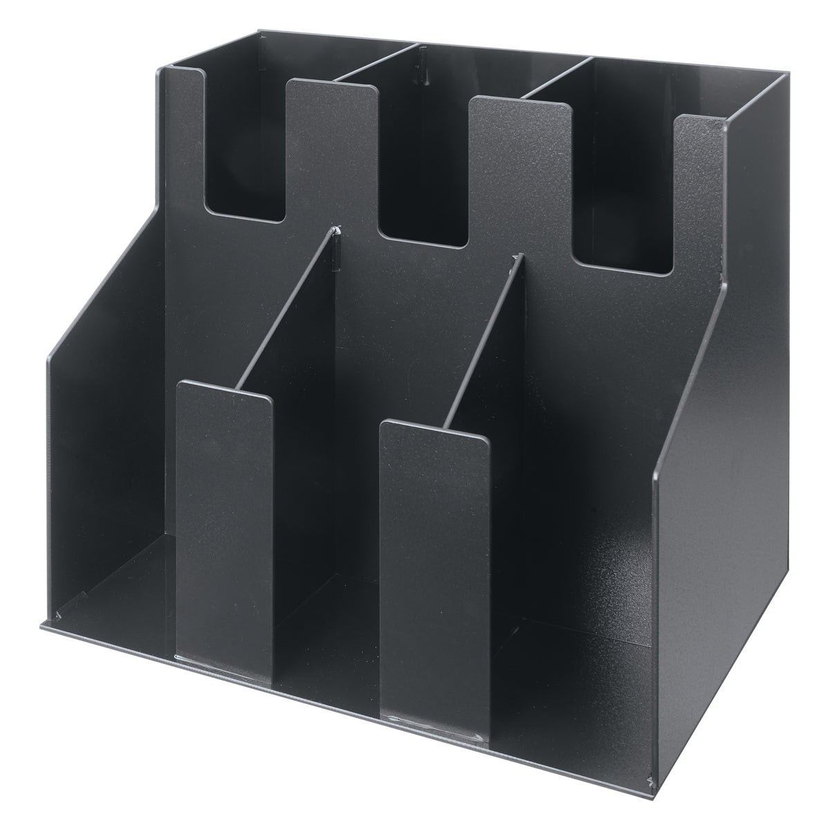 • 2 tiers, 6 compartments • Fits up to 4" diameter cups / lids • Measures 12-11/16"L x 8-5/8"W x 12-1/4"H