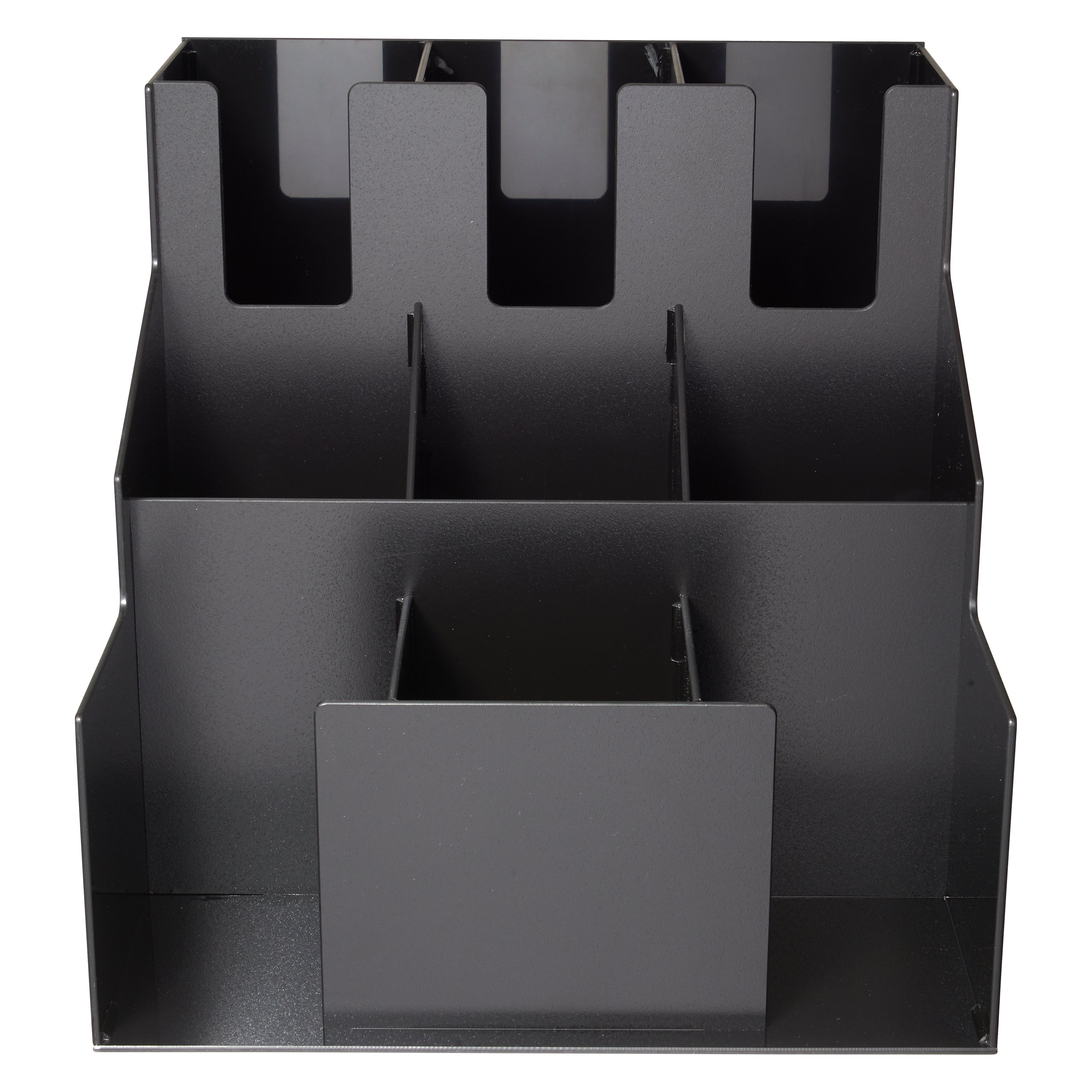 • 3 tiers, 9 compartments • Fits up to 4" diameter cups / lids • Measures 12-5/16"L x 12-3/4"W x 13-1/8"H