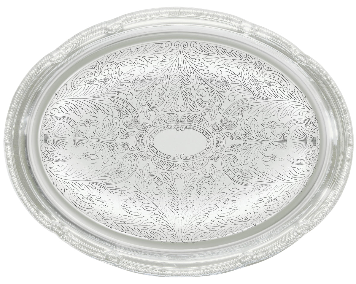 The classic gadroon edge and traditional engraving of these chrome-plated trays are perfect for tea and coffee service, as well as pastries, appetizers and desserts.
