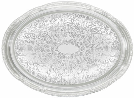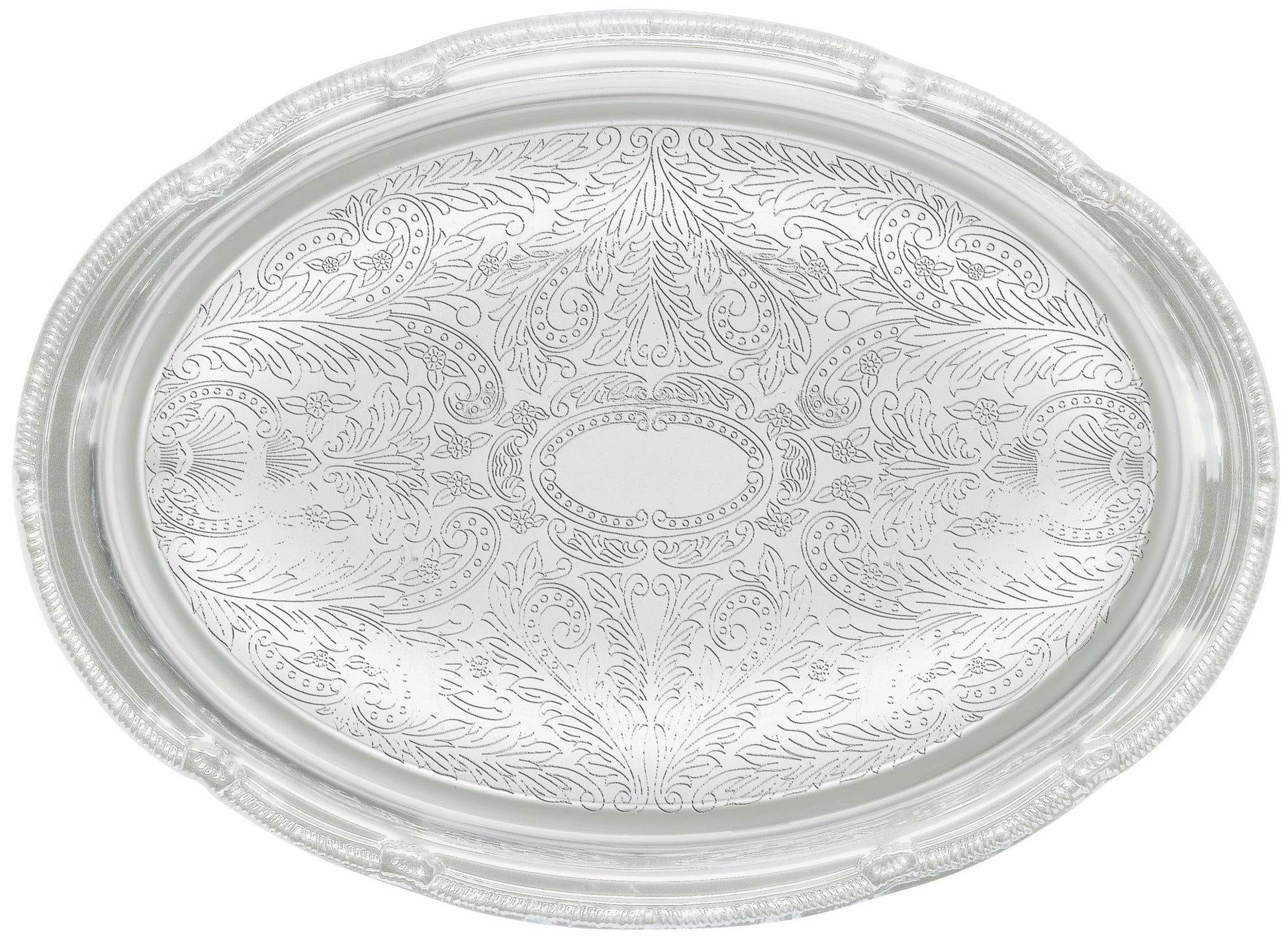 The classic gadroon edge and traditional engraving of these chrome-plated trays are perfect for tea and coffee service, as well as pastries, appetizers and desserts.
