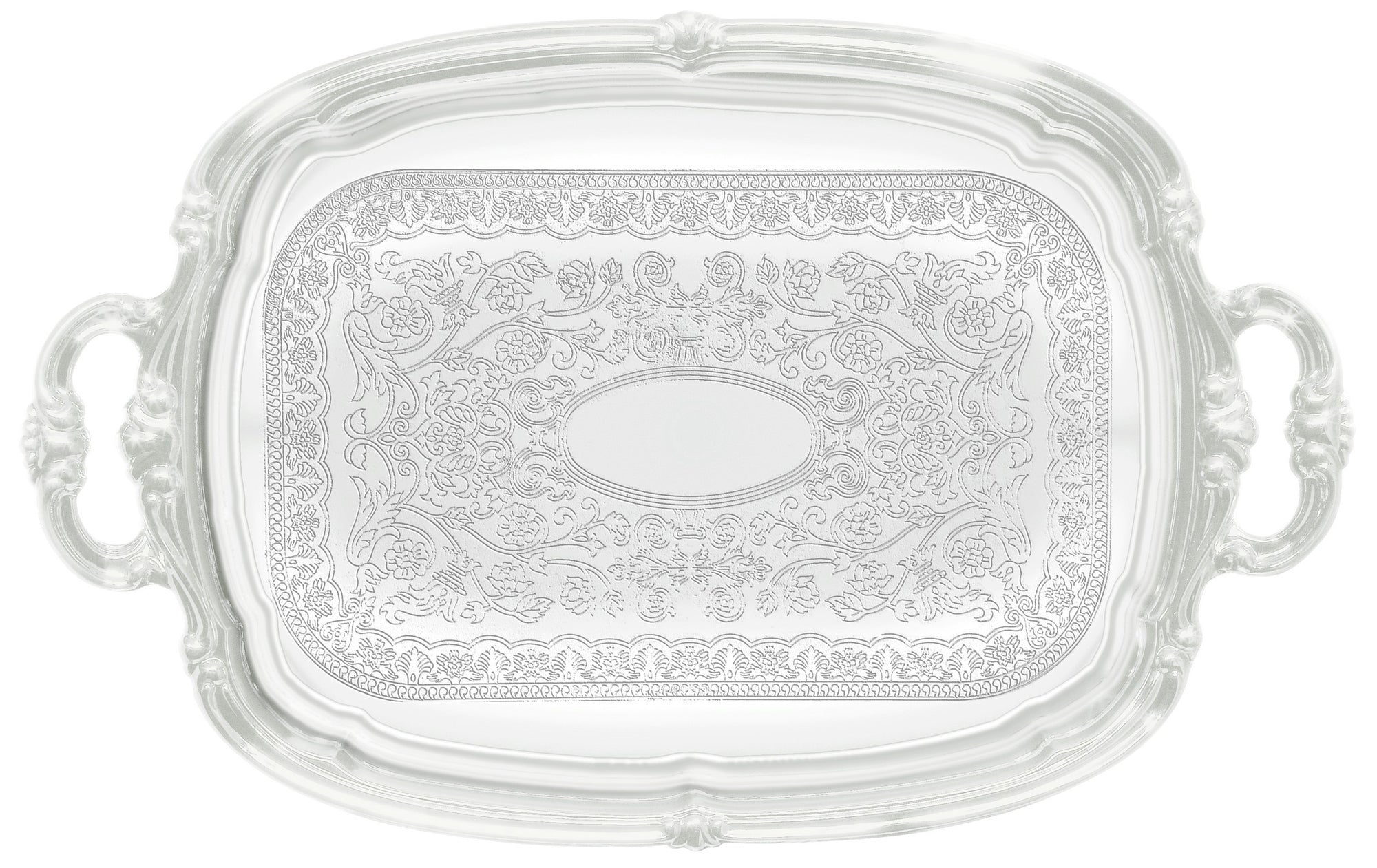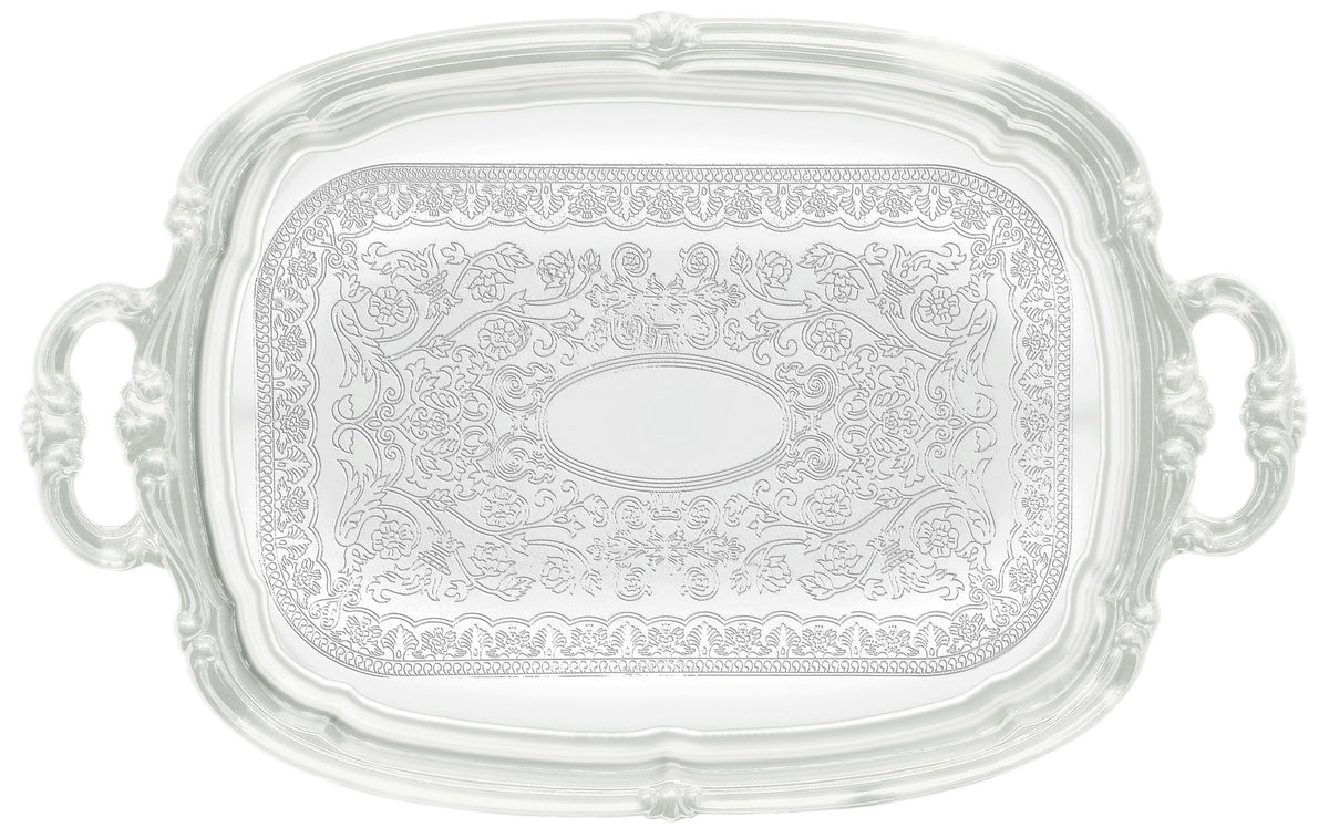 The classic gadroon edge and traditional engraving of these chrome-plated trays are perfect for tea and coffee service, as well as pastries, appetizers and desserts.