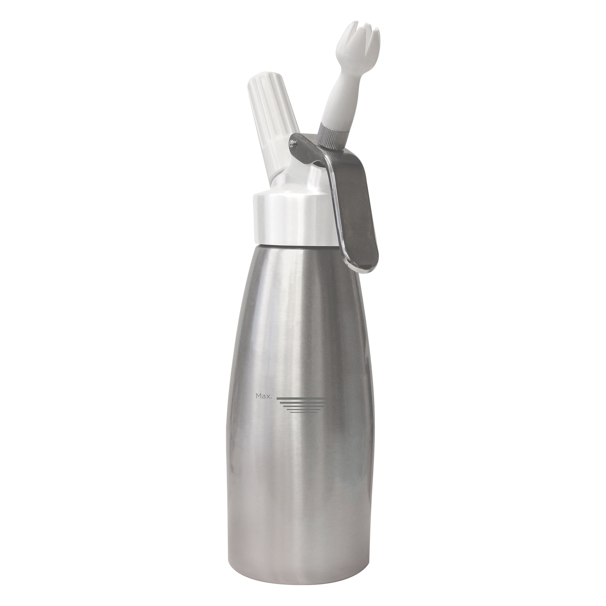 • Includes three (3) decorating tips to create unique dessert and beverage presentations, and a brush to easily clean them • Easy-read maximum (Max./0.5L) capacity line provided • Fits standard 8gm N2O cartridge (not included), and compatible with all brands of whipped cream chargers/cartridges • Durable aluminum bottle and stainless steel handle • Hand-wash only