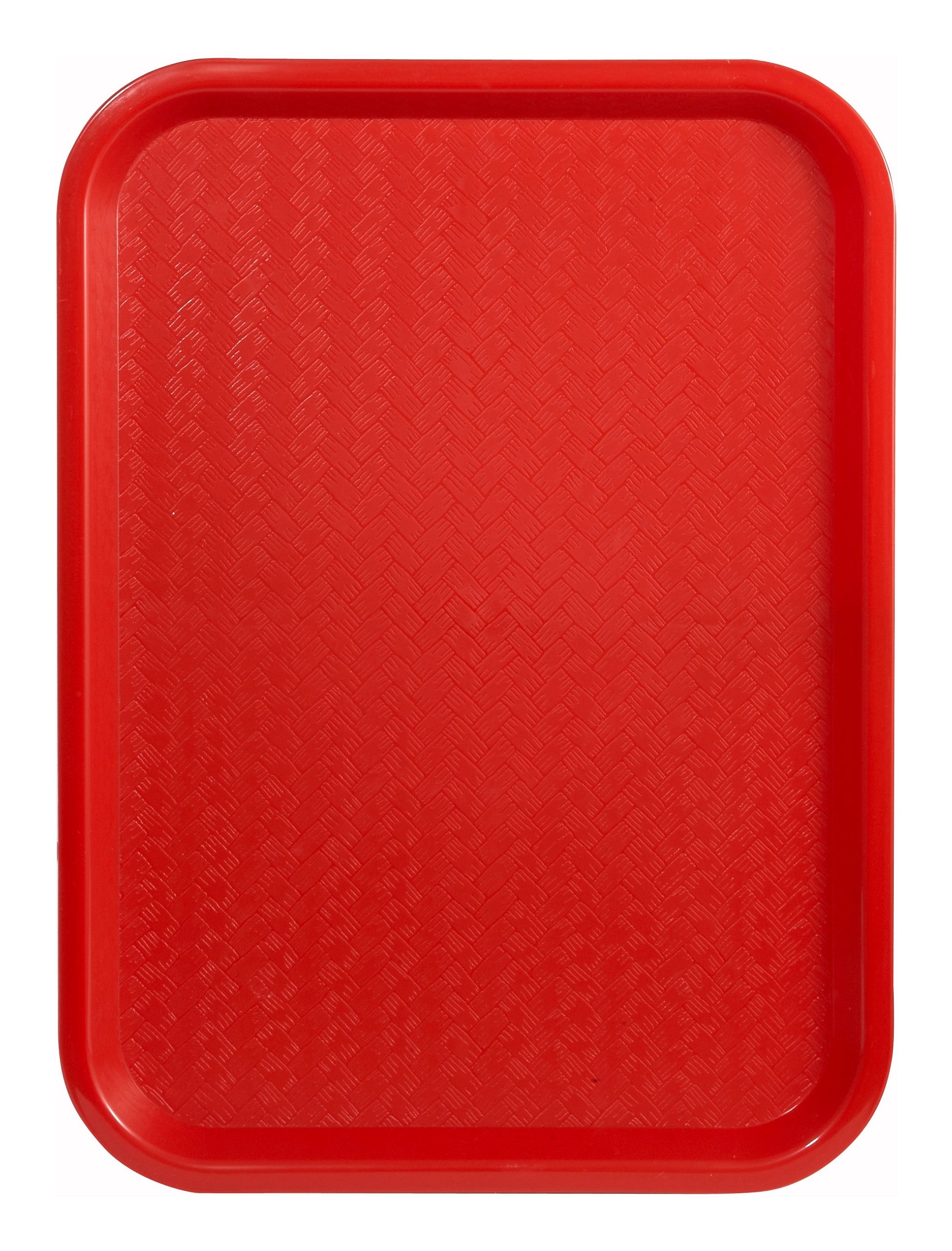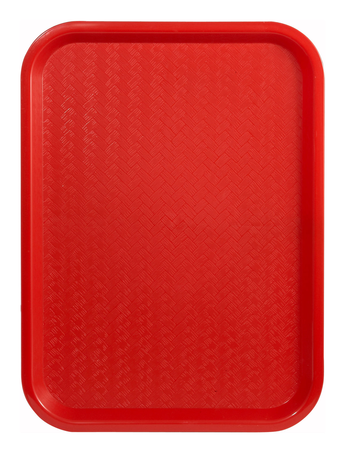 This 10" x 14" red fast food / cafeteria trays by Winco offers unmatched durability ideal for use in a variety of settings including quick service restaurants and snack bars. This plastic tray can also be used around the home for arts and crafts projects, plant saucers and more.The subtle basket weave texture provides extra surface grip so items stay in place when transported reducing spillage. These heavy-duty trays are reinforced preventing bending and warping. Each plastic tray is designed to nest together for space efficient storage. These serving trays are dishwasher safe for both residential and commercial dishwashers. 100% BPA free. NSF listed.