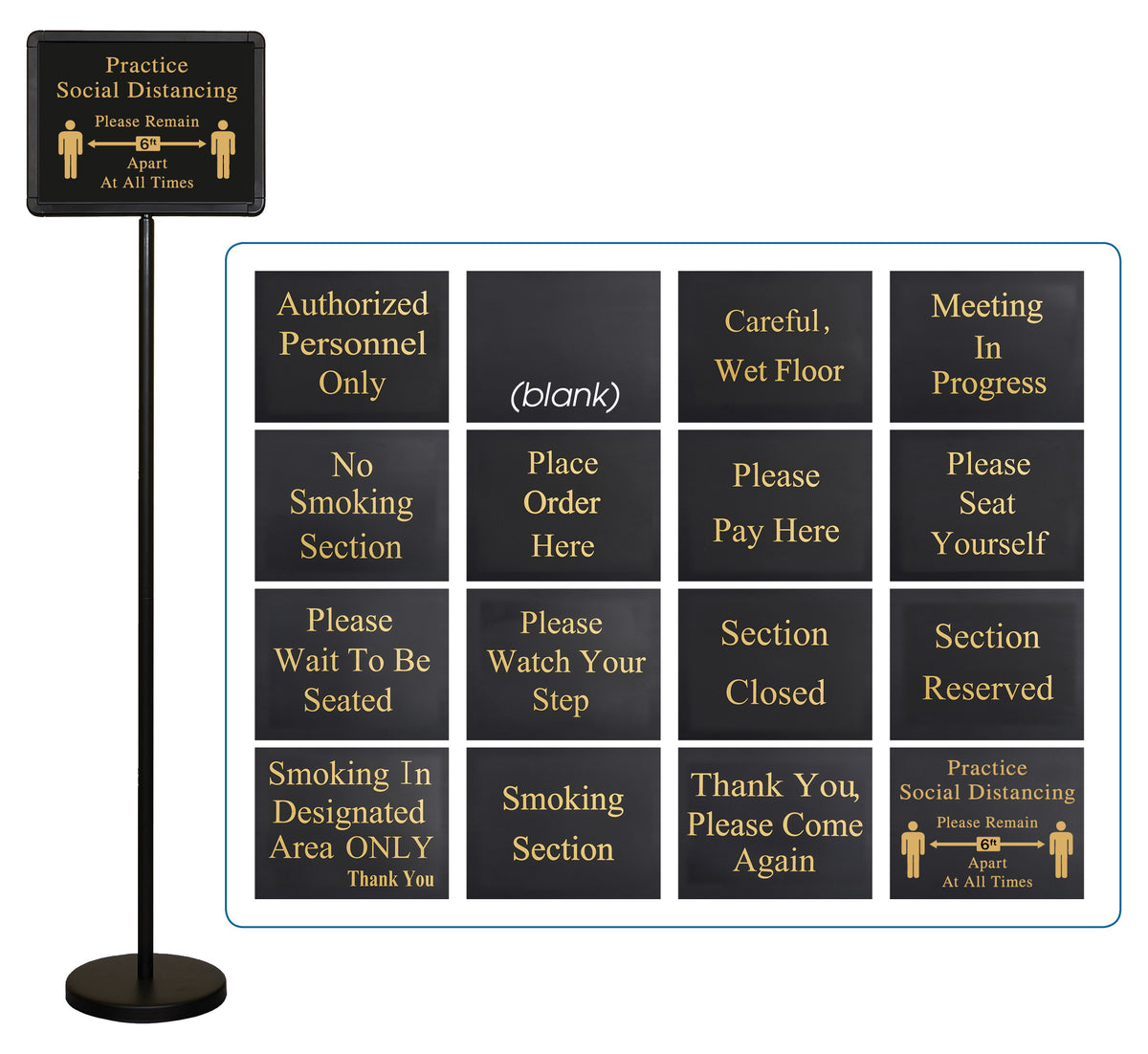 • 60" tall sign stand with 16 interchangeable messages • Pre-printed signs with attractive gold lettering provide optimum visibility • Easy to assemble