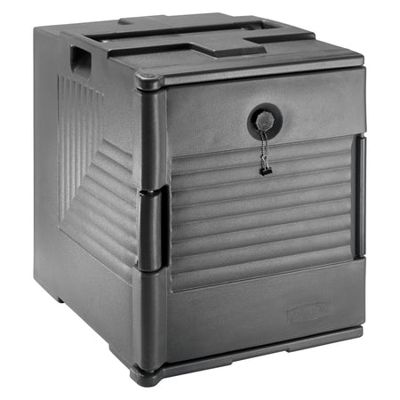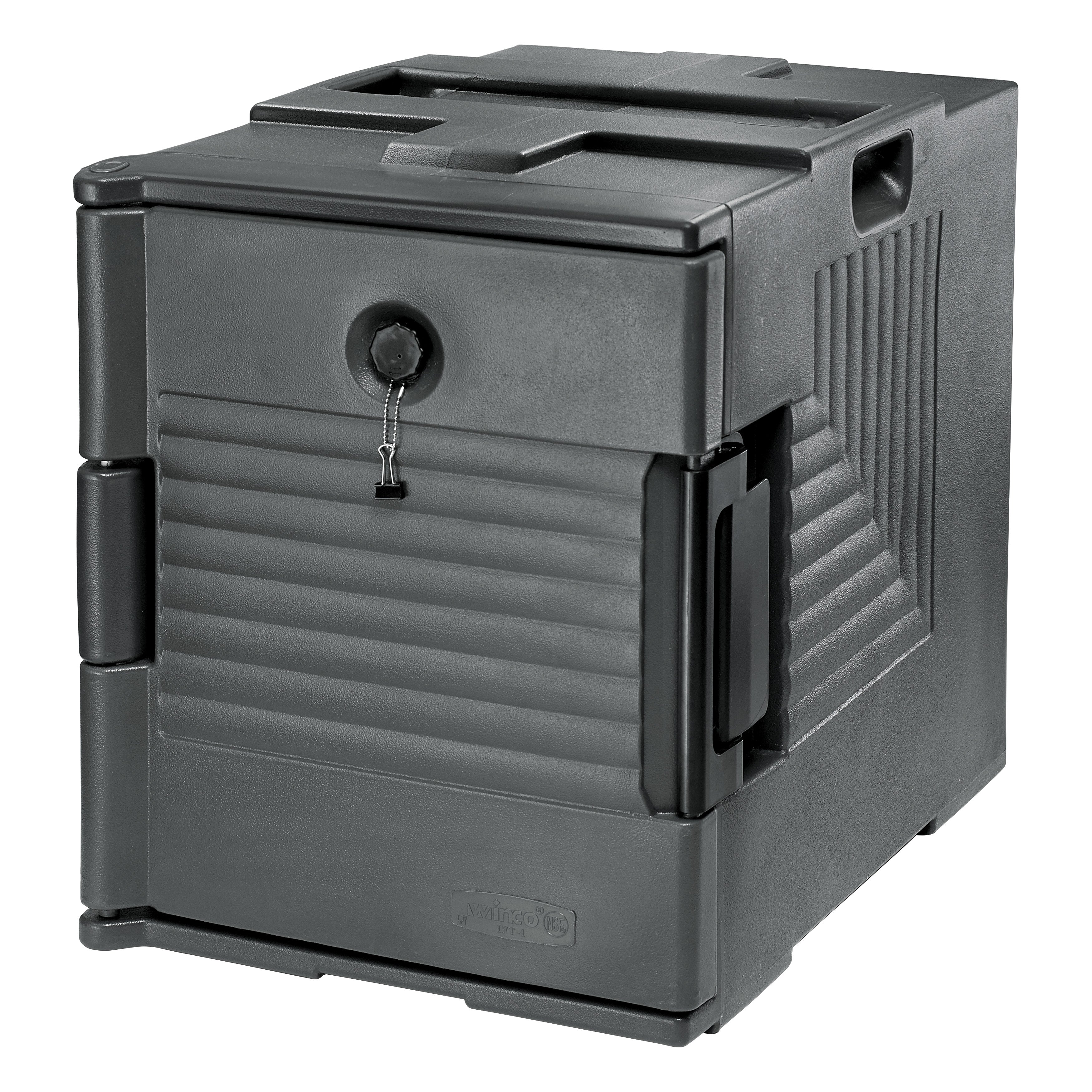 The Winco IFT-1 is an insulated end loading food pan carrier designed to keep foods hot or cold up to 6 hours without the need for electricity ideal for caterers, restaurants, event venues and more. Made from heavy-duty molded polypropylene, this food pan carrier is designed to withstand daily use in a commercial foodservice environment. The pan carriers are specially designed to stack together for secure transport perfect for both on-side and off-site catering. The flexible pan configurations and generous sizing allow this pan carrier to fit: (6) full-size, 2.5” food pans, (4) full-size, 4” high food pans, (3) full-size, 6” high food pans, (4) half-size, 6” tall food pans, (8) half-size, 4” high food pans, (9) 1/3 size, 6” high food pans, (12) 1/3 size, 4” high food pans or (6) 1/3 size, 8” high food pans. Hold times will vary based on ambient external temperatures. Exterior dimensions: 18.75” x 26.75” x 24.5” (L x D x H). Interior dimensions: 13.25” x 21” x 19.31” (L x D x H). This food pan carrier is NSF listed.