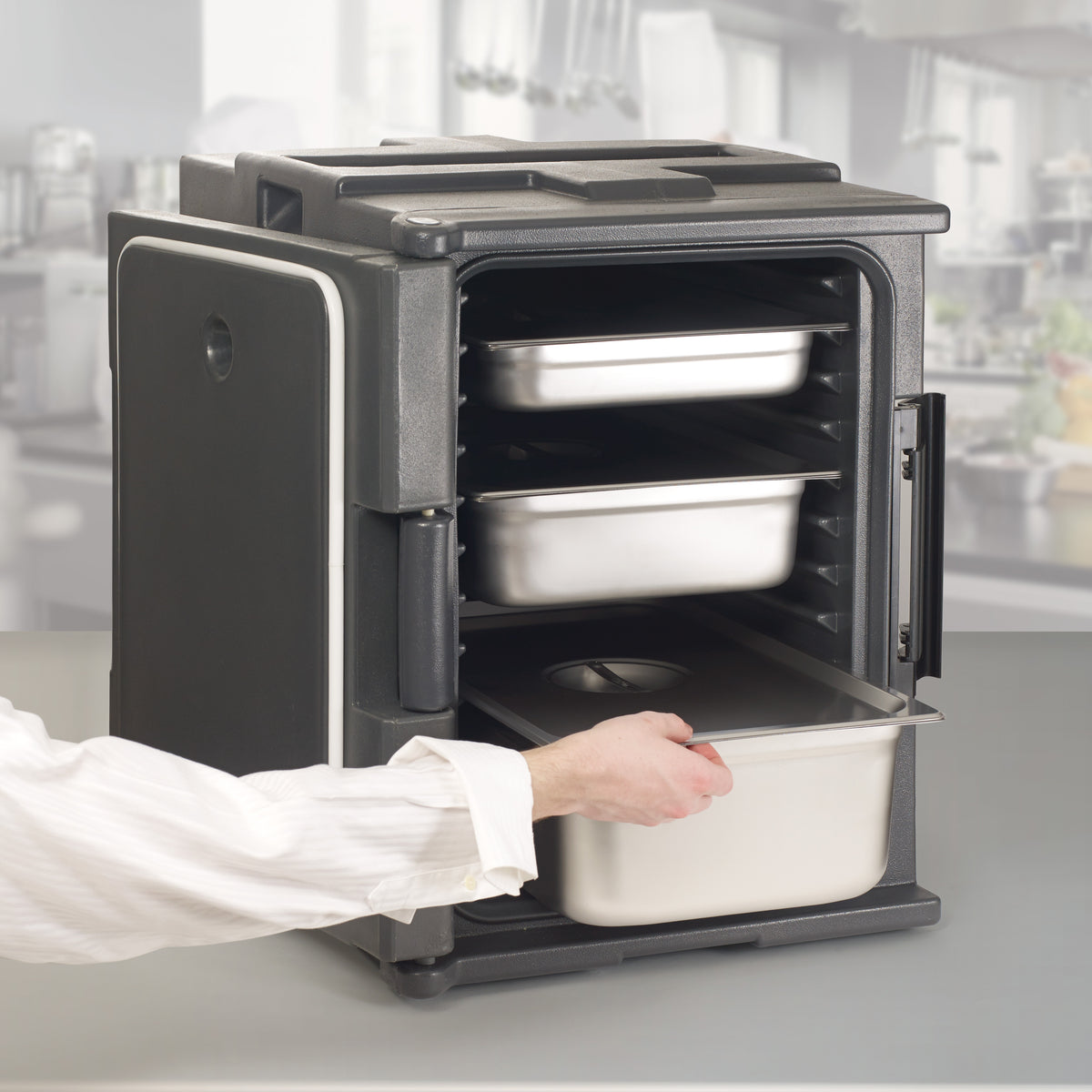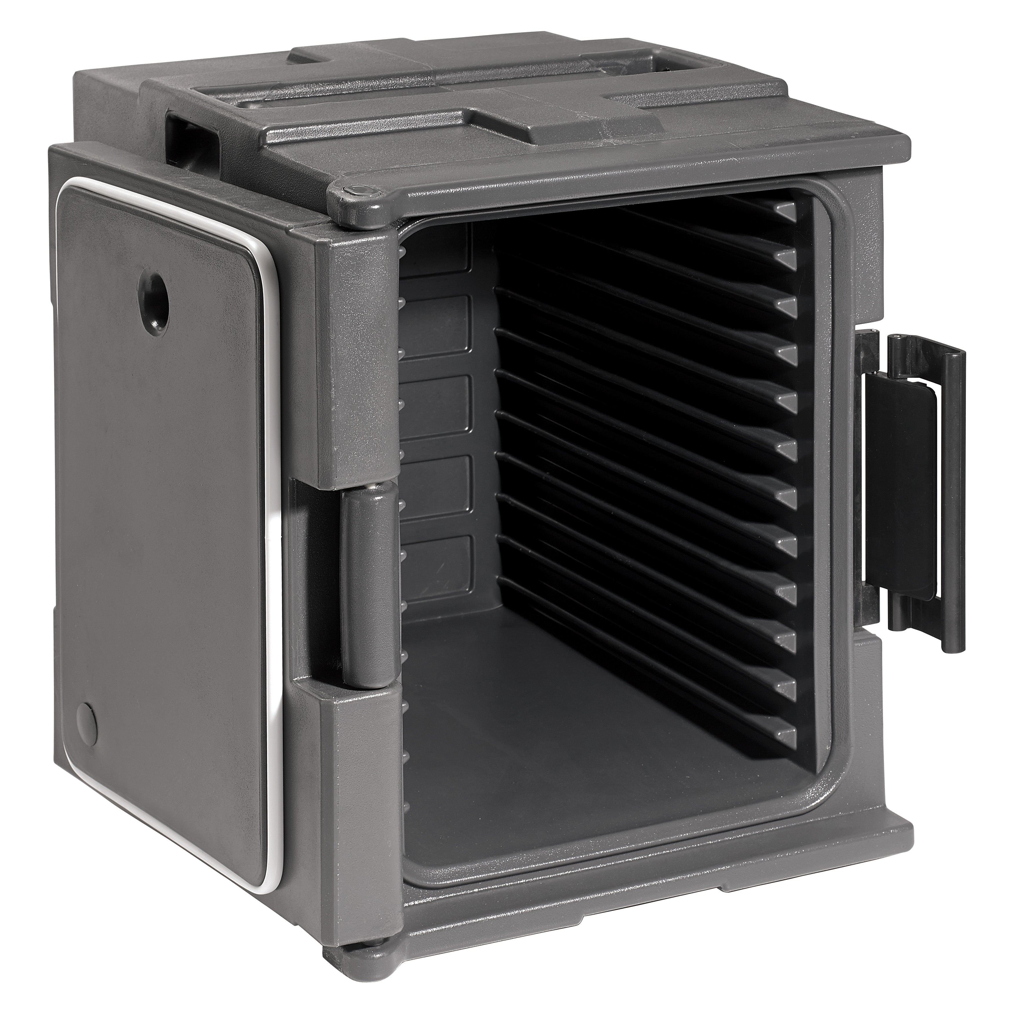 • Long Hold Times – Specially engineered insulation material keeps food hot or cold up to 6 hours without the need for electricity ideal for caterers, restaurants and hotels • Flexible Pan Configurations – Can accommodate a variety of food pan configurations including holding up to (6) full-size hotel pans or (12) 1/3 size food pans • Heavy-Duty – Commercial-grade molded polypropylene exterior is designed to withstand daily use and transport in busy foodservice environments • Stackable – Designed to stack together for secure and efficient transport to off-site catered events • NSF Listed