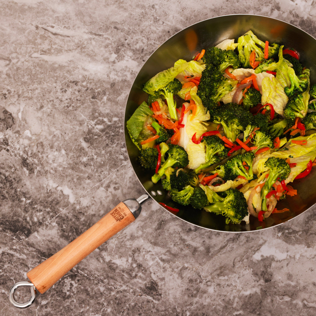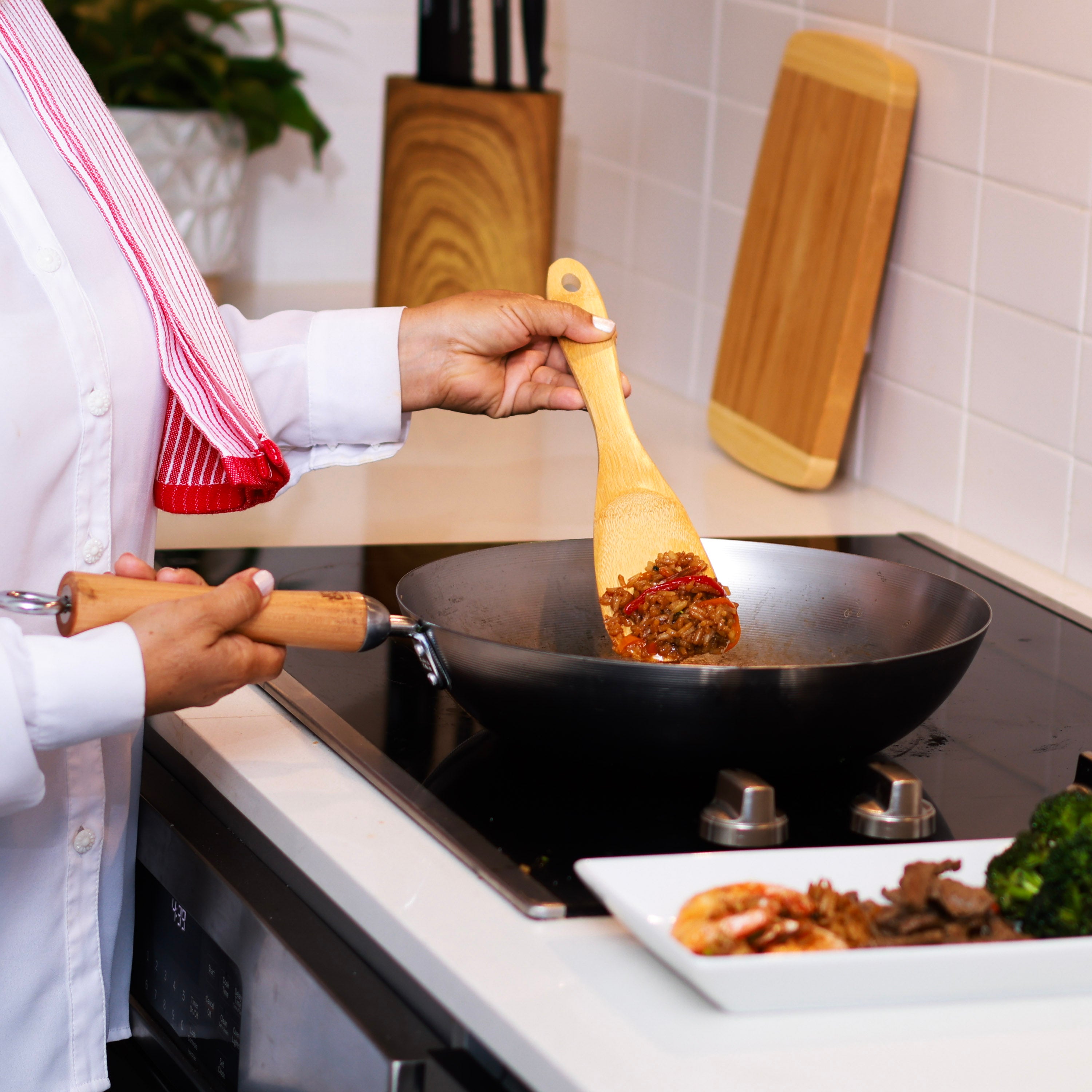 • The uncoated wok surface adds savory umami flavors to cooked foods as it is seasoned over time