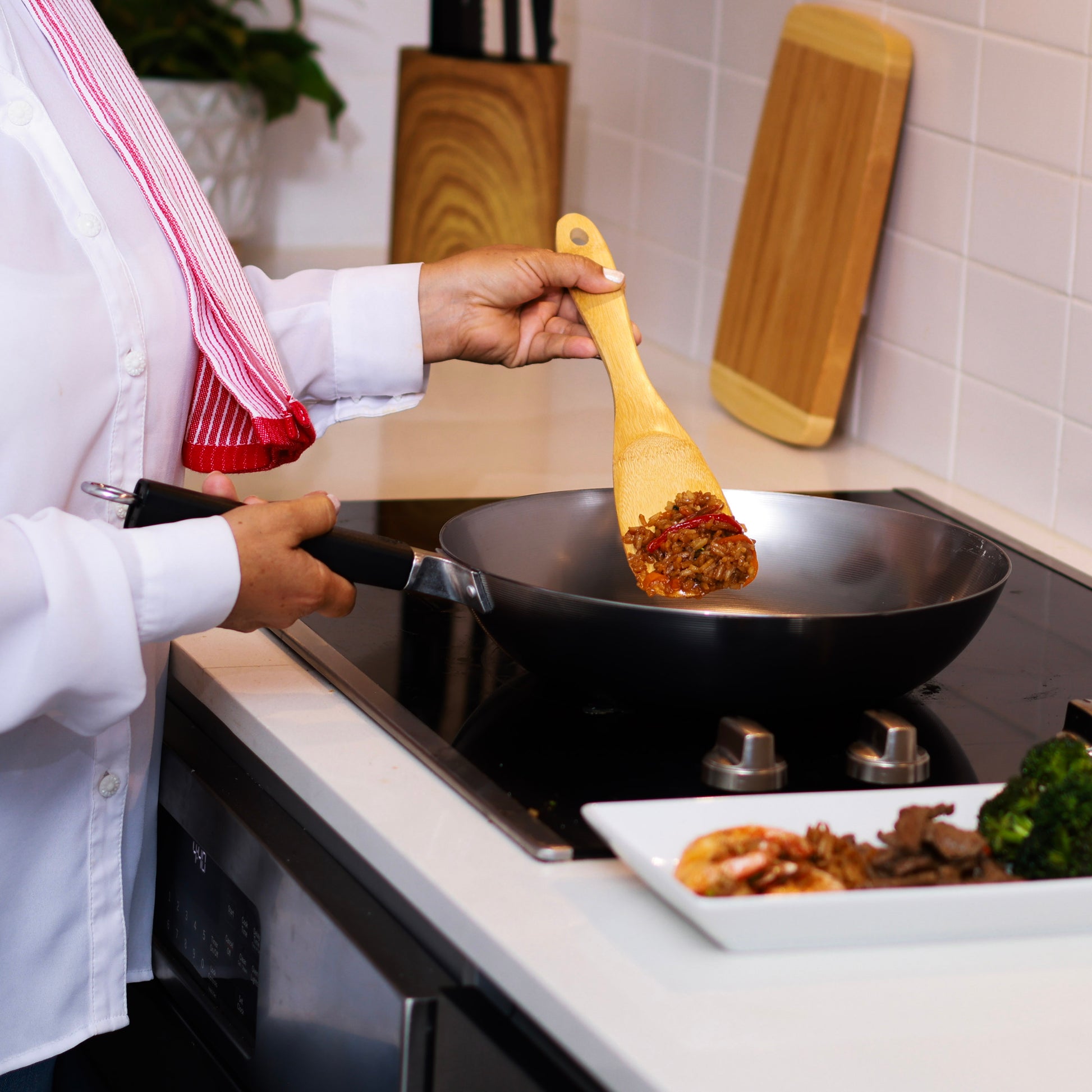 • The uncoated wok surface adds savory umami flavors to cooked foods as it is seasoned over time