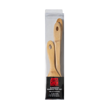 • Set consists of a bamboo stir fry spatula, a mixing spoon, and a rice paddle