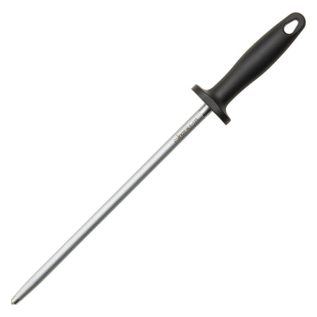 • 12” long round stainless steel rod maintains a sharp knife blade • Comfortable plastic handle with protective finger guard • Hang hole for easy storage