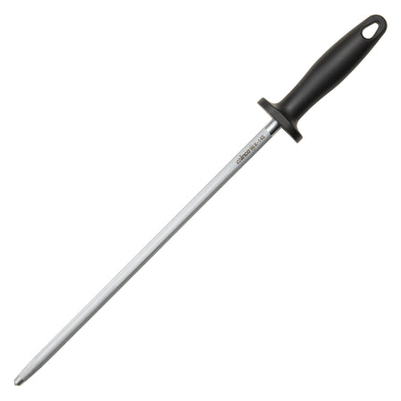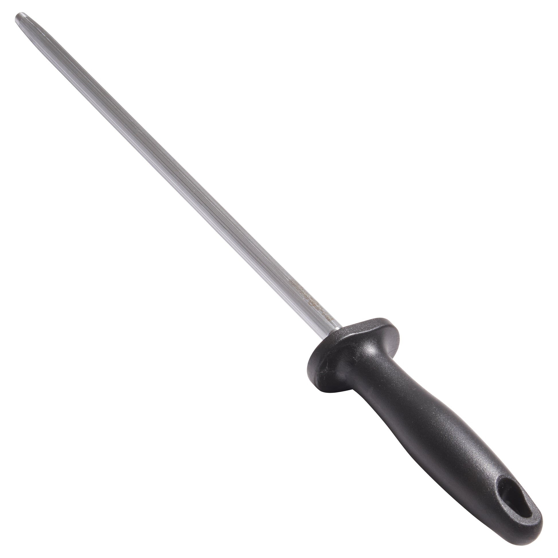 • 14” long round stainless steel rod maintains a sharp knife blade • Comfortable plastic handle with protective finger guard • Hang hole for easy storage