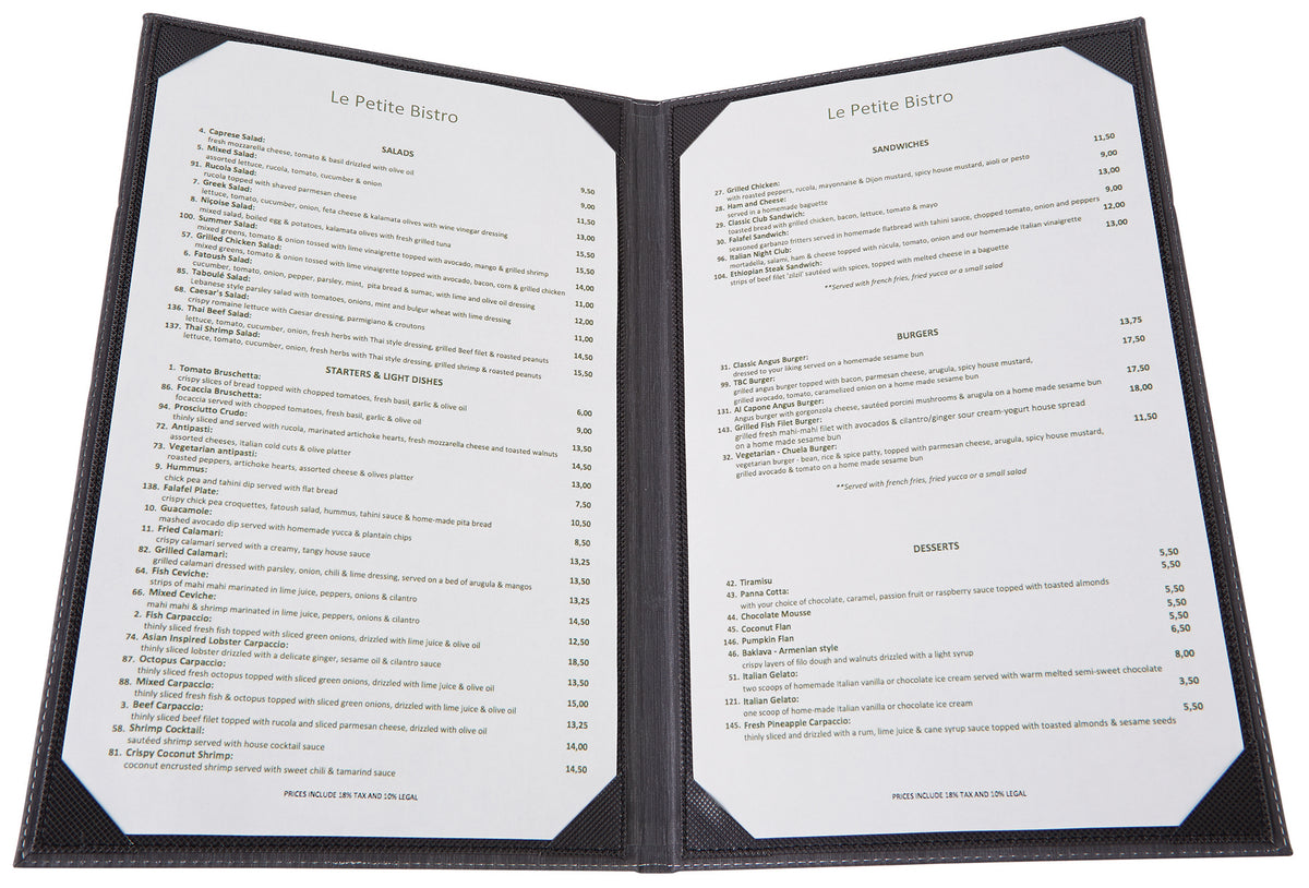 Chic leatherette menu covers provide an elegant yet durable display for full-service or fast casual restaurants alike. The refined double-sided stitched menu covers offer the look of a customized menu without the customization wait times - a timeless style in a full collection to complement any dcor.