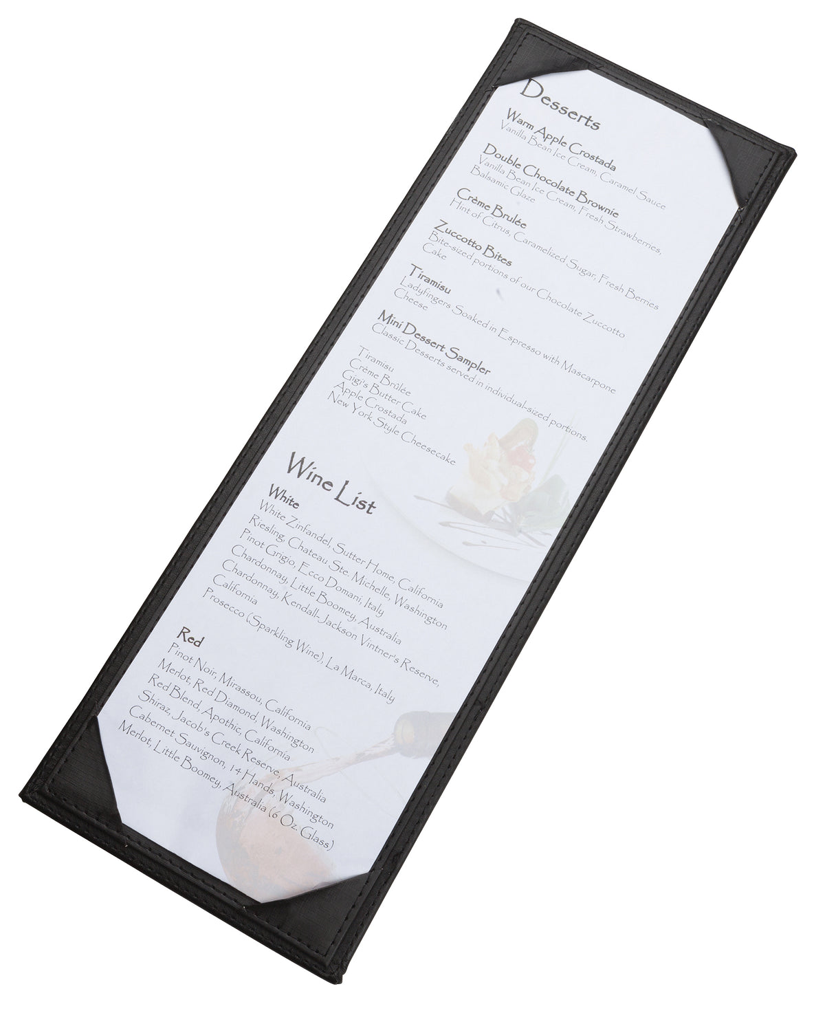 • Features secure interior picture corners • Available for both letter and legal size pages • Three neutral color choices and patterns • Most common sizes and page configurations available • Great for lunch or tapas menus, drink specials and desserts • LMS-414BK fits 4-1/2" x 14" paper • LMS-811 series fits 8-1/2" x 11" letter size paper • LMS-814 series fits 8-1/2" x 14" legal size paper