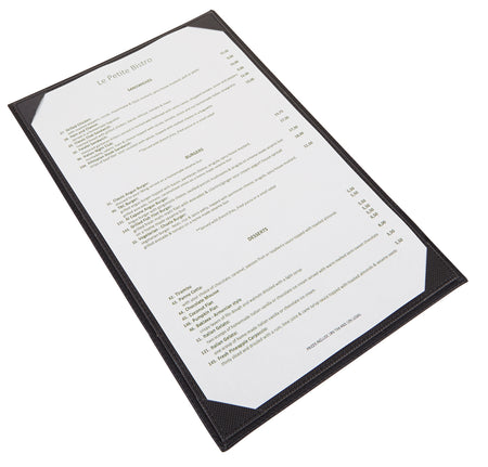 • Features secure interior picture corners • Available for both letter and legal size pages • Three neutral color choices and patterns • Most common sizes and page configurations available • Great for lunch or tapas menus, drink specials and desserts • LMS-414BK fits 4-1/2" x 14" paper • LMS-811 series fits 8-1/2" x 11" letter size paper • LMS-814 series fits 8-1/2" x 14" legal size paper
