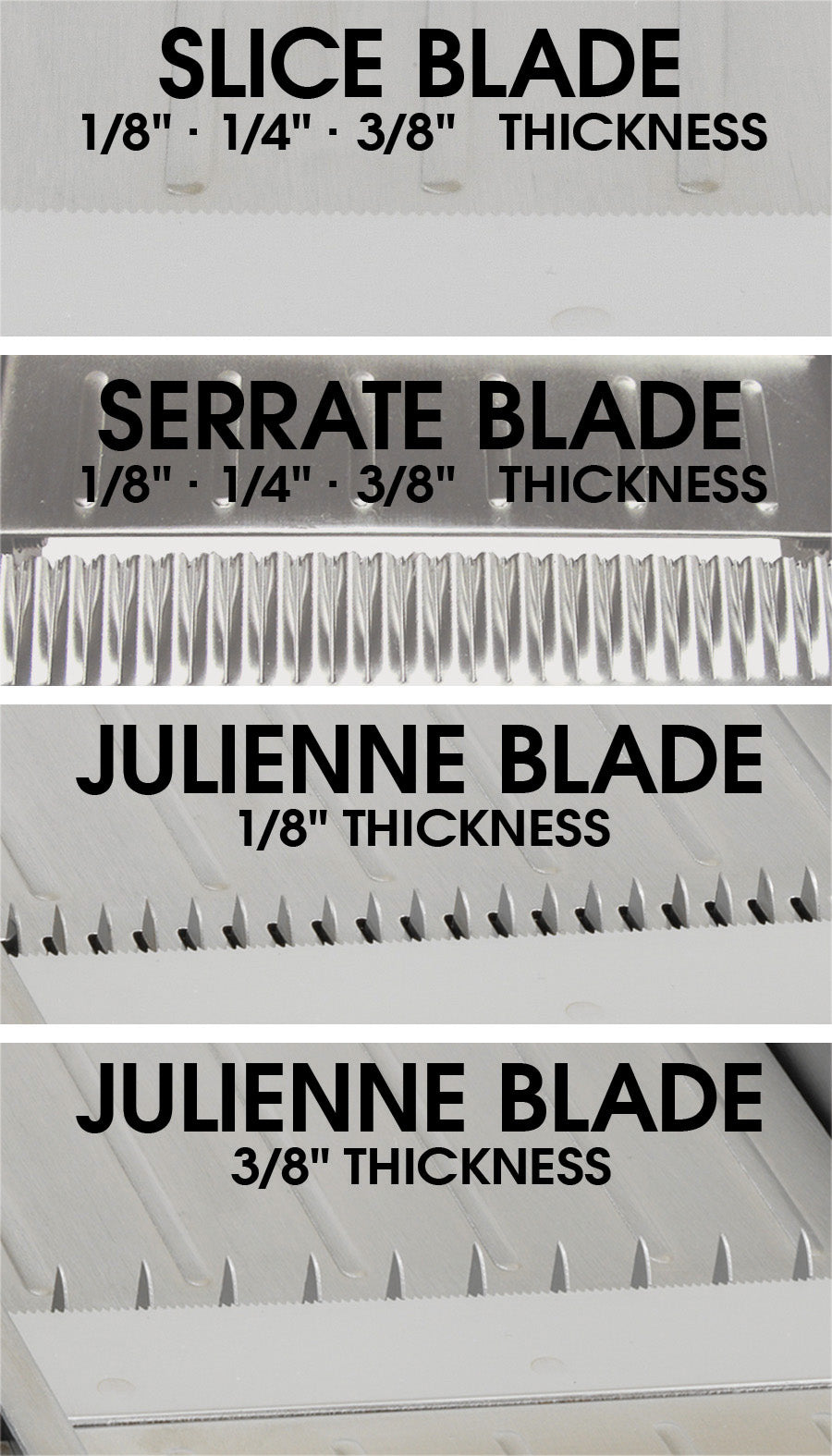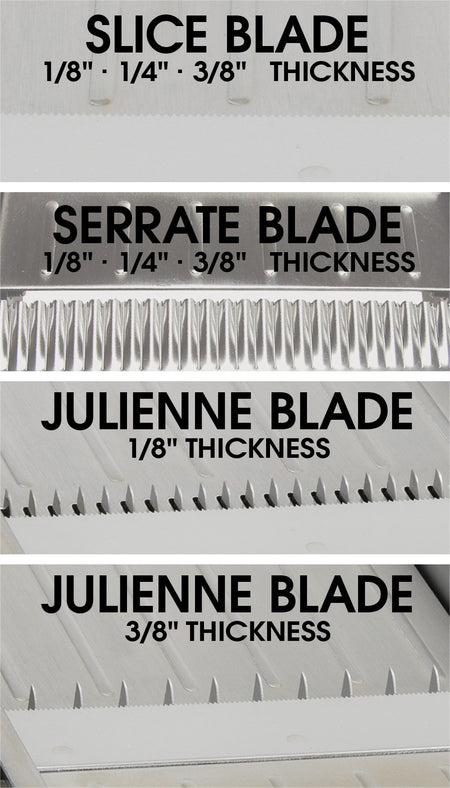 • Three (3) built-in blade styles, each with multiple thicknesses: Straight slice (1/8", 1/4", 3/8"), Serrated / Wavy (1/8", 1/4", 3/8"), and Julienne (1/8", 3/8")
