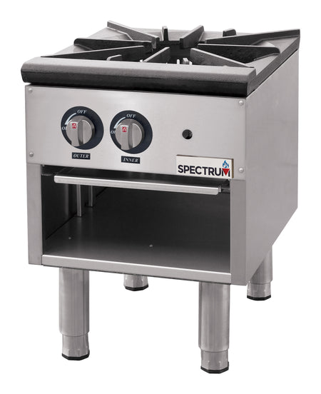 • Low Profile – Designed for kitchens with limited space allowing for a low work height ideal for use with tall commercial stock pots • High Output Burner – (1) natural gas burner with (3) concentric rings output 80,000 BTUs ideal for heating large stock pots quickly • Cast Iron Grate – Heavy-duty cast iron grates can securely support the heaviest stockpot • Infinitely Adjustable – Dual infinite heat controls allow for precise temperature control • 3/4” gas connection for natural gas or liquid propane