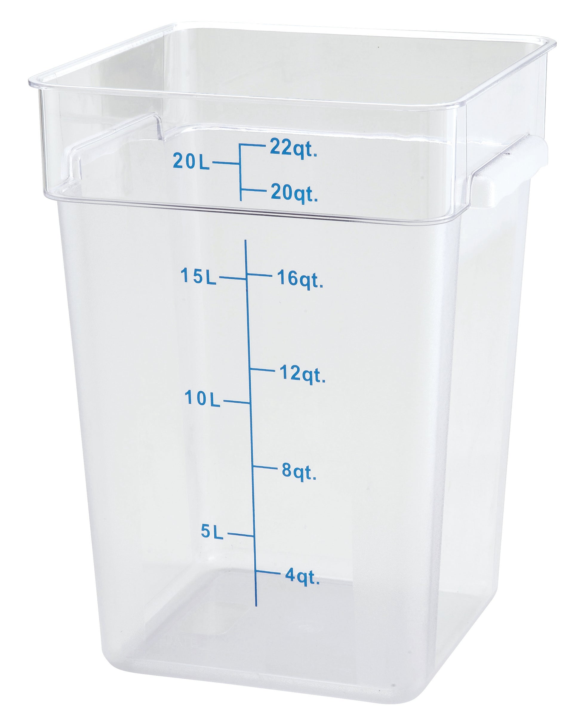 • Clear polycarbonate is extremely durable, stackable, withstands temperatures from -40F to 210F, and is ideal for the storage and transport of raw or prepared food • Built-in handles, graduation markings in liters and quarts • Dishwasher safe • NSF listed