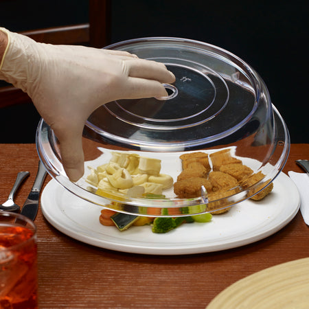 Clear polycarbonate plate cover is designed to keep food hot and safe while serving.