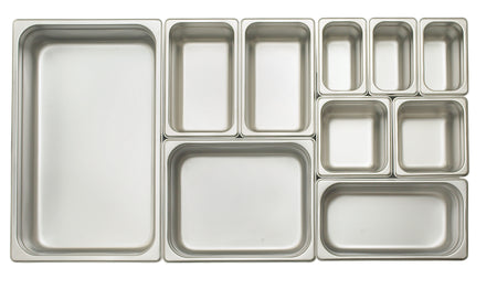 • Anti-jamming pans available in all gauges • Straight-sided pans available in standard weight • Every gauge weight is made of 18/8 stainless steel • NSF listed
