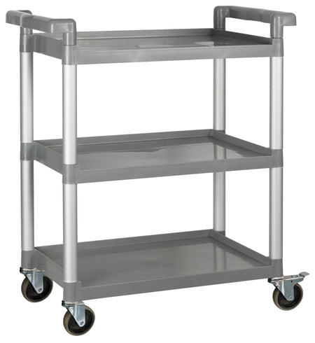 • The Winco heavy-duty utility cart has a 330 pound weight capacity and was designed for commercial use in restaurants, offices, warehouses and more. This utility cart features 3 shelves and has overall dimensions of 32” x 16.125” x 36.75” (L x W x H). The 4 swivel casters allow for easy maneuverability even when transporting heavy loads. Two brakes secure the cart when stationary. The polypropylene shelves are easy to clean making this an ideal bussing cart.